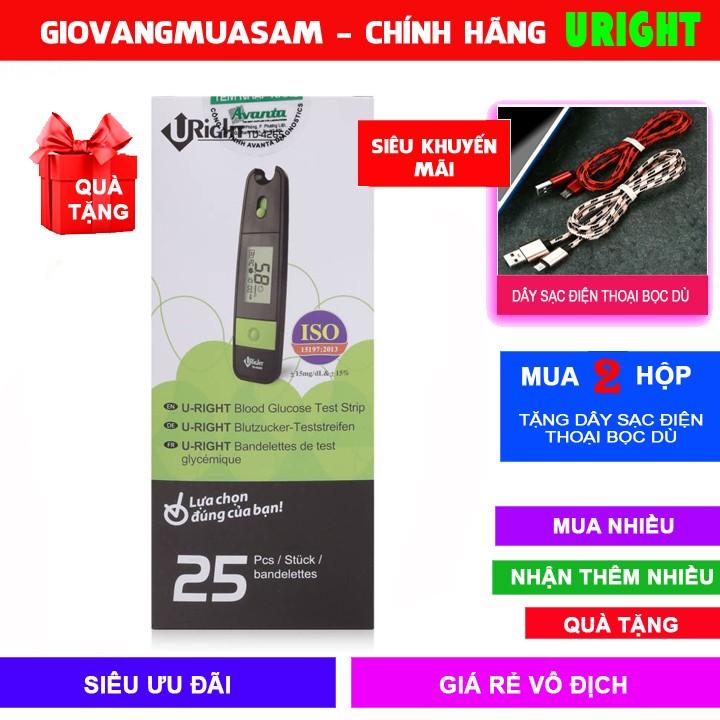 Que Thử Đường Huyết 25 que Cho Máy Uright TD4265 tặng 25kim chích + Tặng thêm 25 miếng bông tẩm cồn + Mua từ 2 hộp tặng thêm dây sạc điện thoại bọc dù