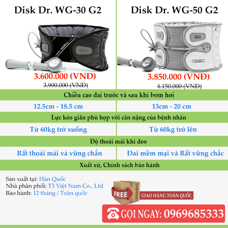 Đai lưng DiskDr. WG50 G2 tại Việt Nam là phiên bản mới nhất của dòng đai kéo giãn cột sống nổi tiếng này. Với đai lưng DiskDr. hiện tại đang có 2 phiên bản dành cho người nhẹ cân (WG30 G2) và cho người nặng cân (WG50 G2). Mời bạn tham khảo bảng so sánh tính năng giữa 2 sản phẩm này.