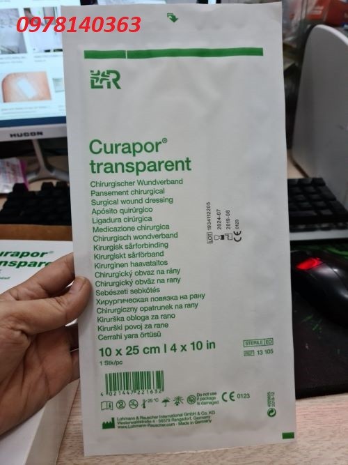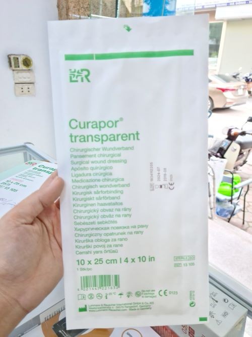 Đặc điểm gạc dán vết thương hút dịch không thấm nước Curapor TP: - Gạc dán vết thương hút dịch không thấm nước Curapor Tp là loại băng keo có gạc vô trùng trong suốt Curapor Transparent có 2 lớp, một lớp bông gạc có phủ một lớp chống dính và một lớp film ngăn nước và vi khuẩn xâm nhập do đó bệnh nhân có thể tắm sau khi dán. - Sản phẩm bên ngoài là miếng film trong suốt bên trong có gạc hút dịch giúp vết thương mau lành và tránh nhiễm trùng. - Gạc dán vết thương hút dịch không thấm nước lưu hơn 3 ngày hạn chế tốn kém chỉ thay băng khi dịch bên trong quá nhiều hoặc miếng dán bị bong. - Sản phẩm được sản xuất bởi hãng L&R, nước sản xuất: Đức/Áo. - Sản phẩm có nhiều kích thước: ♦ Curapor 7 x 5cm (hộp 50 miếng). ♦ Curapor 10 x 8cm (hộp 25 miếng). ♦ Curapor 10 x 15cm (hộp 25 miếng). ♦ Curapor 10 x 20cm (hộp 25 miếng). ♦ Curapor 10 x 25cm (hộp 50 miếng)