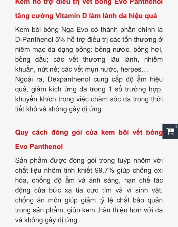 Bỏng da do nước sôi hoặc do lửa hay va chạm vào vật đang có nhiệt độ cao như bô e… có thể gây nên tổn thương nghiêm trọng trên da. Nếu không để ý và khắc phục sớm thì làn da bị sẹo lồi, vết thâm. Kem bôi chữa bỏng Evo Panthenol là sản phẩm mang tới công dụng: