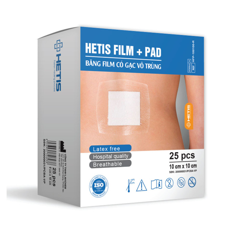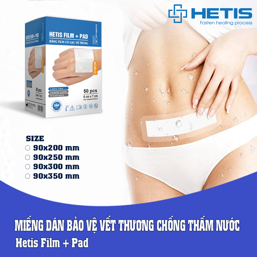 – HETIS FILM + PAD là băng film có gạc vô trùng có 2 phần: phần màng PU (polyurethane film) được phủ lớp keo không gây dị ứng, lớp màng bán thấm, ngăn nước, vi sinh vật xâm nhập nhưng vẫn cho phép hơi nước thoát ra và trao đổi oxy (MVTR (moisture vapor transmission rate) ≥ 600 g/m2.24h) và phần gạc cotton thấm hút ở giữa (có phủ 1 lớp chống dính đặc biệt).