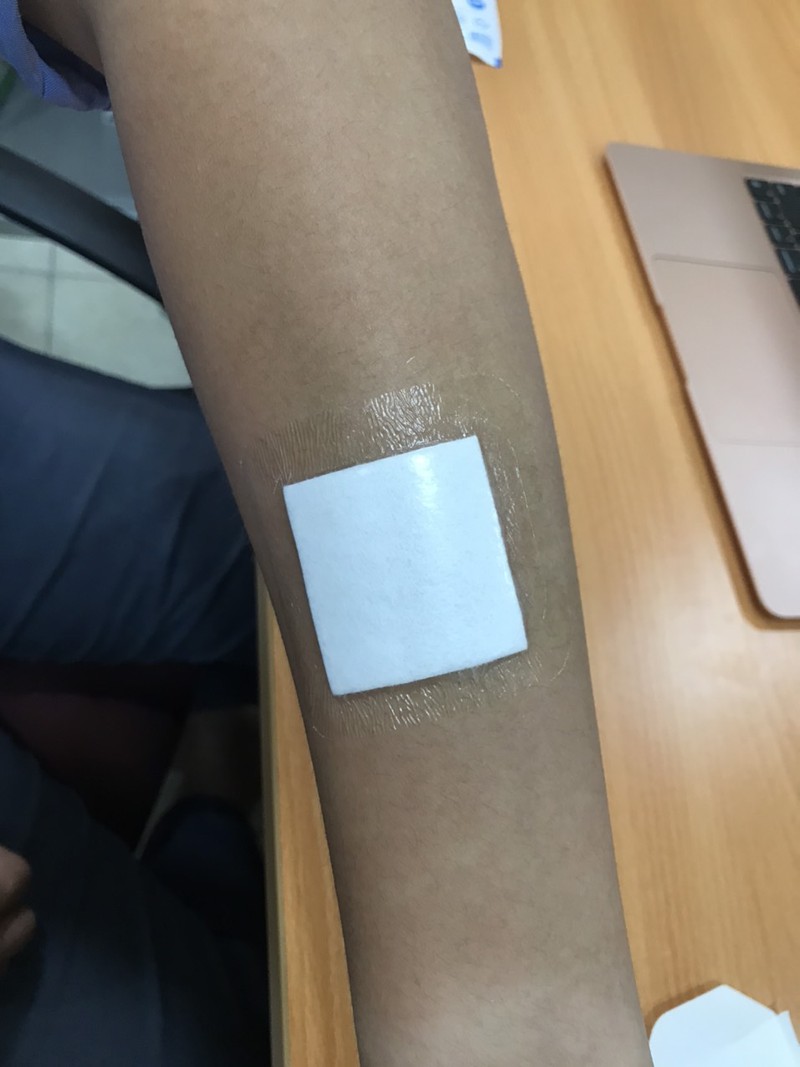 - Lấy gạc ra khỏi bao gói, tách nhẹ hai mép giấy lót ra hai bên để lộ miếng gạc, đặt gạc lên vết thương. Tách rời hoàn toàn lớp giấy lót, vuốt nhẹ gạc từ trong ra ngoài để gạc dính chặt lên da, cuối cùng loại bỏ lớp màng PE phía trên bằng cách bóc theo đường S-line ở giữa.
