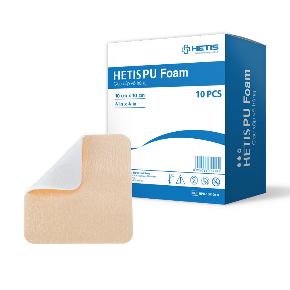 Hộp 10 miếng Gạc xốp thấm hút dịch vết thương HETIS PU FOAM (size 10x10cm) - Gạc cho vết bỏng, vết loét