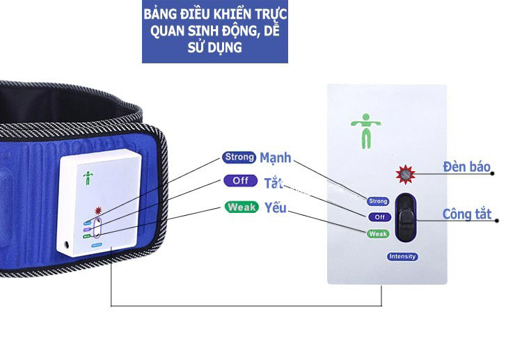 - Bạn quấn đai x5 vào bụng, tùy chỉnh theo yêu cầu máy có 2 chế độ massage, strong là mạnh, weak yếu. Tắt thì chỉ qua off.