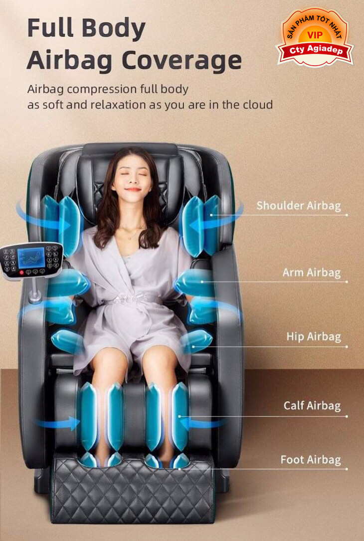 - Ghế được trang bị 30 túi khí phân bổ đều trên toàn bộ cơ thể. Có 1 điểm rất đặc biệt ở chiếc ghế massage quốc dân này đó chính là khả năng massage phần đầu, rất hiếm ghế massage có phần túi khí ở vùng đầu. Đặc điểm này cho phép ghế có thể thực hiện thao tác ấn, miết vùng thái dương.