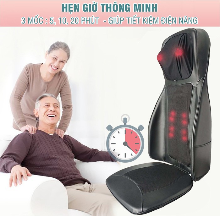 Ghế massage lưng, cổ, mông xoa bóp day ấn rung, nhiệt hồng ngoại Nikio NK-180 có chế độ hẹn giờ thông minh với 3 mốc thời gian cho bạn lựa chọn là 5 phút, 10 phút, 20 phút. Bạn có thể cài đặt thời gian massage phù hợp với nhu cầu của mình thông qua remote và máy sẽ tự động tắt khi hết giờ. Tính năng này giúp bạn tiết kiệm điện năng và kiểm soát thời gian sử dụng tốt hơn.