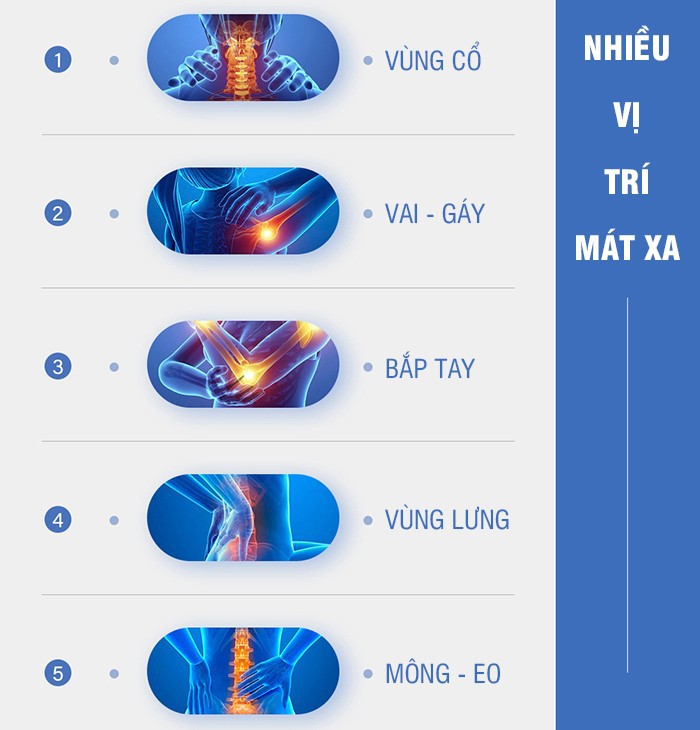 Các vị trí mát xa: Lưng trên, lưng dưới, mông, cổ vai gáy