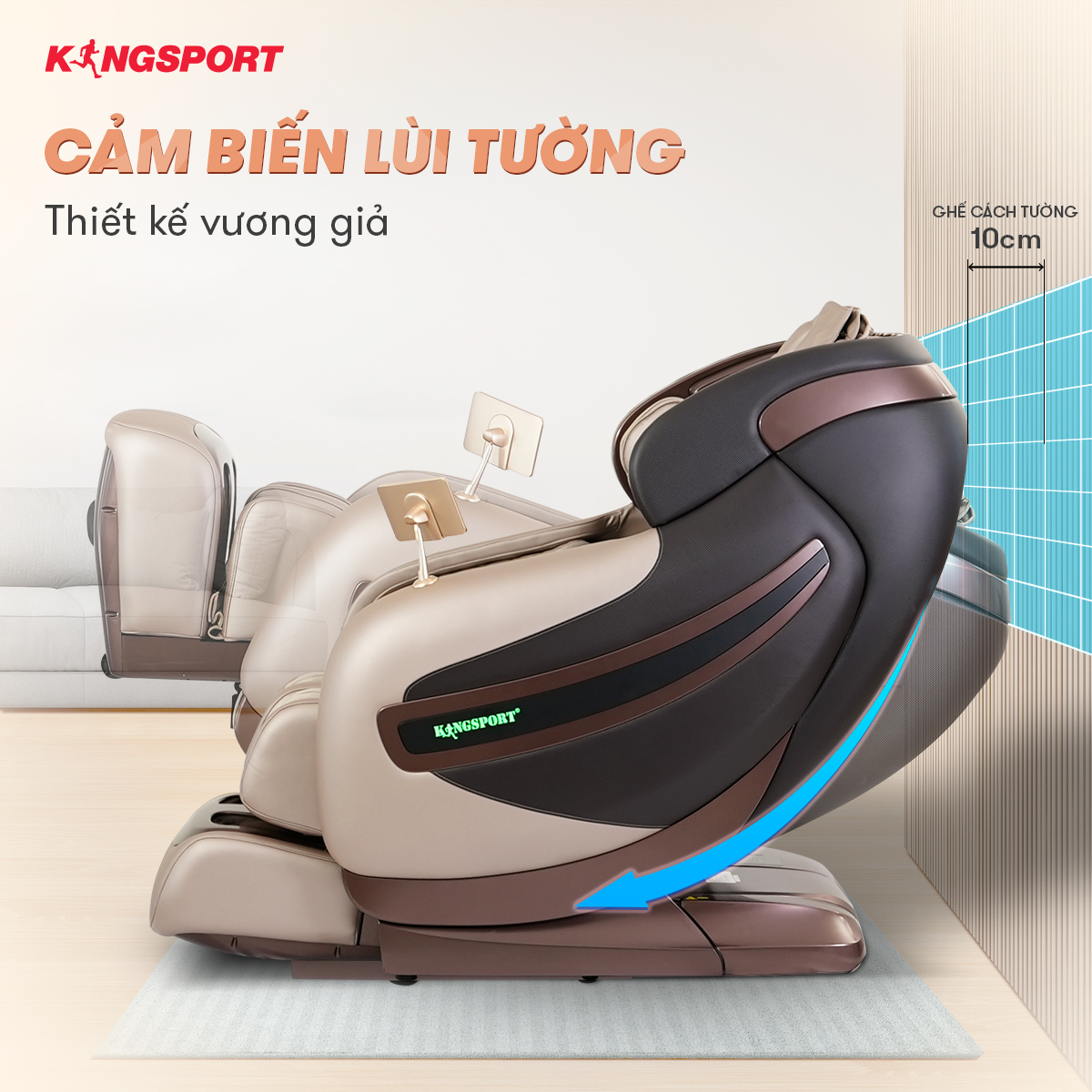 Thông thường khi hoạt động, ghế sẽ ngả ra sau khiến bạn không thể đặt ghế sát tường. Ghế massage G4 NEW được bổ sung công nghệ cảm biến lùi tường, tự động trượt về phía trước để ghế luôn cách tường 6-10cm, giúp bạn tiết kiệm tối đa không gian cho gia đình.