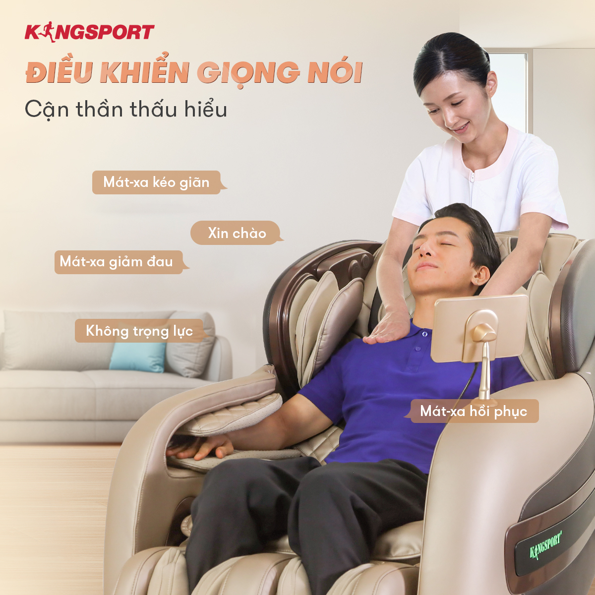 Ngoài điều khiển trên máy tính bảng, ghế còn tích hợp khả năng điều khiển bằng giọng nói với ngôn ngữ tiếng Việt. Để khởi động bài massage yêu thích, bạn chỉ cần nói “Xin chào” và yêu cầu tên bài massage, ghế sẽ nhận diện câu lệnh và hoạt động theo ý muốn của bạn.