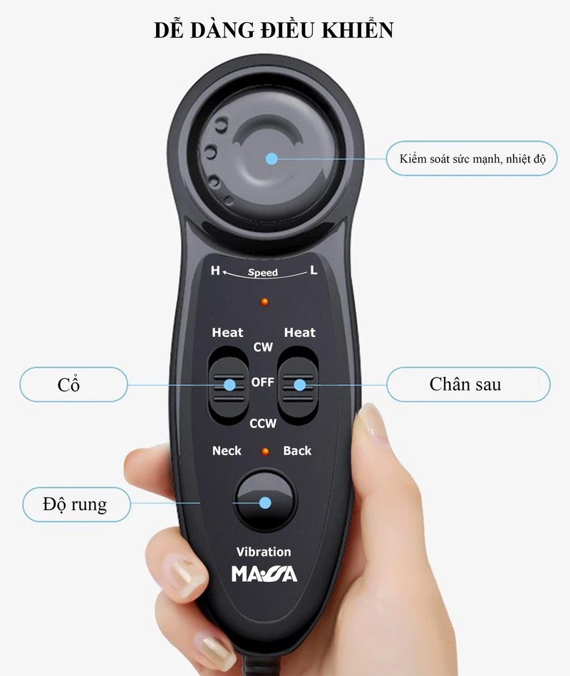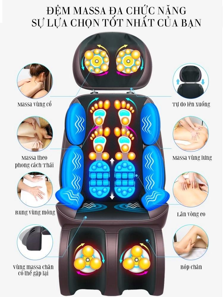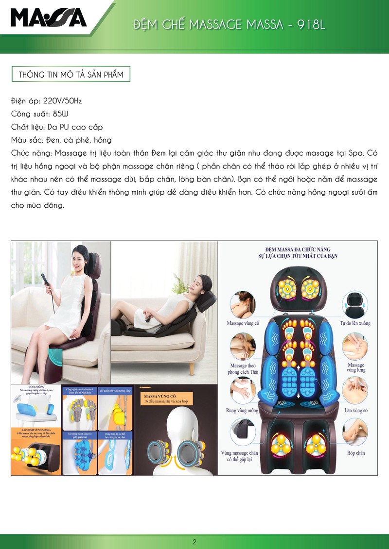 Đệm ghế massage MASSA-918LĐiện áp: 220V/50HzCông suất: 85WChất liệu: Da PU cao cấpMàu sắc: Đen, cà phê, hồng 🤗 Một chiếc ghế mát xa thực hiện tốt chức năng xoa bóp vừa giúp thư giãn vừa có khả năng mát xa sâu hỗ trợ trị liệu. Với các phương pháp nhào, lăn… Những liệu pháp này rất thích hợp cho người đang mệt mỏi, thiếu năng lượng, những người mắc bệnh thoái hóa cốt sống, thoát vị đĩa đệm, tê bì tay chân… Khả năng Massage trị liệu toàn thân tác động vào các huyệt quan trong của cơ thể từ các vùng vai gáy, cổ, lưng, 2 bên sườn đến mông đùi, chân kết hợp hồng ngoại làm ấm cơ thể - Bước sóng của tia hồng ngoại trùng với cùng bước sóng của cơ thể con người kích hoạt và kích thích các tế bào trao đổi chất, tăng cường tuần hoàn máu đem lại cảm giác thư giãn như đang được masage tại Spa. Ngoài ra Ghế massage tác động vào các cơ cụ thể, giải phóng sự tích tụ acid lactic – nguyên nhân gây đau cơ đồng thời khi cơ bắp thư giãn, sự mất cân bằng được điều chỉnh. Mang đến sự thoải mái một cách nhanh chóng, bao gồm các động tác massage và kéo giãn cơ thể, các khớp xương, điều chỉnh vóc dáng, cải thiện tư thế đứng.Có thể nằm hoặc ngồi trong khi mát xa. Vùng mát xa cẳng chân có thể dùng mát xa bàn chân. Những lưu ý khi sử dụng ghế massage: 🤗 Nên massage 15 phút mỗi ngày.🤗 Không dùng cho trẻ em dưới 10 tuổi và phụ nữ có thai.🤗 Không sử dụng khi đang bị vết thương ngoài da.🤗 Không sử dụng hồng ngoại quá 2 tiếng liên tục.🤗 Sau khi sử dụng nhớ rút phích nguồn.🤗 Sản phẩm nổi tiếng xuất khẩu bán tại các thị trường Mỹ, Châu Âu, Châu Á được công nhận chứng chỉ quốc tế về chăm sóc sức khỏeCam kết sản phẩm đến tay ngừời tiêu dùng giống 100% hình ảnh và mô tả. Cam kết giá luôn luôn tốt nhất. Và quan trọng chúng tôi chỉ nhập hàng chất lượng. Sản phẩm, 1 đổi 1 trong 7 ngày, bảo hành 12 tháng nếu do lỗi của nhà sản xuất.giá 🚛 vận chuyển toàn quốc
