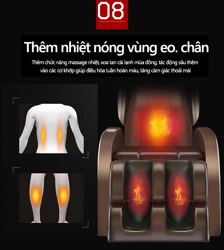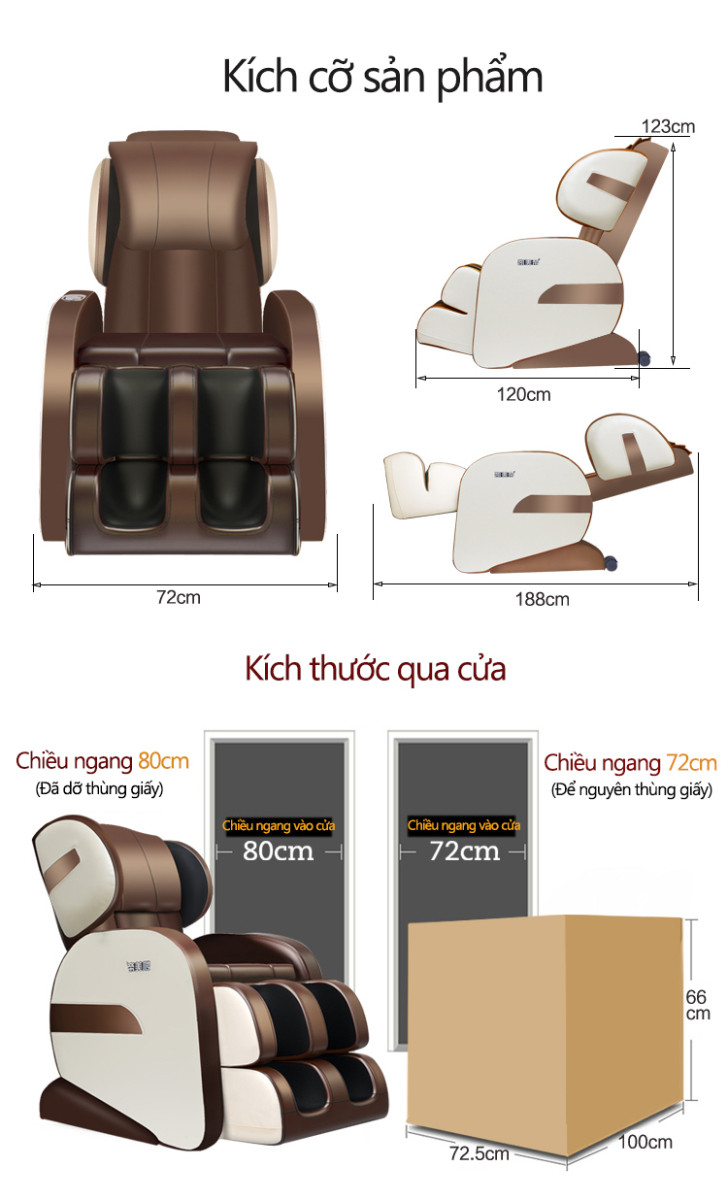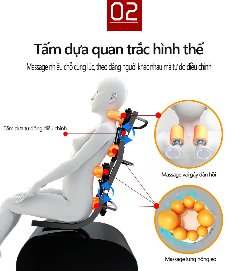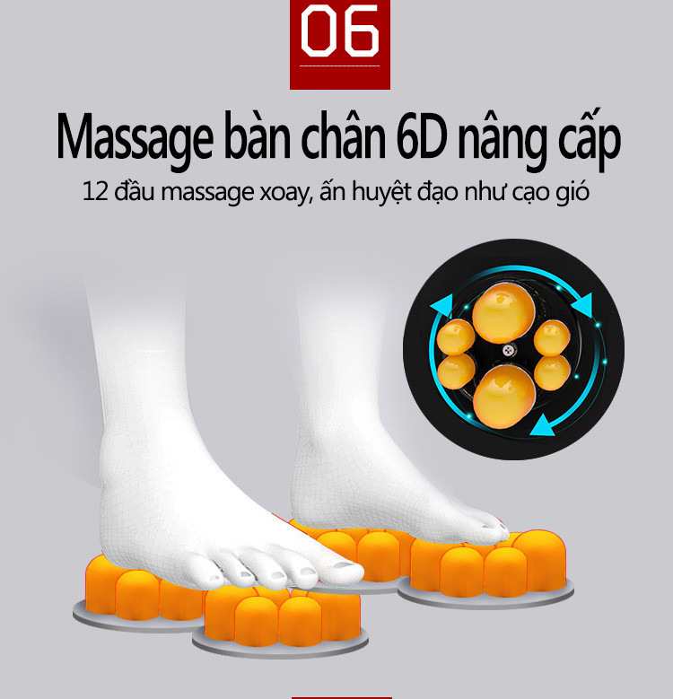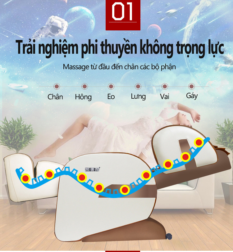 Không tốn không gian trong nhà, có thể đế cách tường chỉ khoảng 5cm Nhiều đầu masage cơ học mô phỏng như thủ pháp tay người Trục ghế cong SL theo đường cong cơ thể cho đầu masage tiếp xúc gần sát hơn với cơ thể Phần đệm chân có thể chỉnh cho phù hợp với chiều cao mỗi người Con lăn mát xa cạo gió gan bàn chân