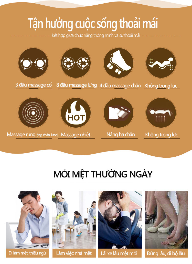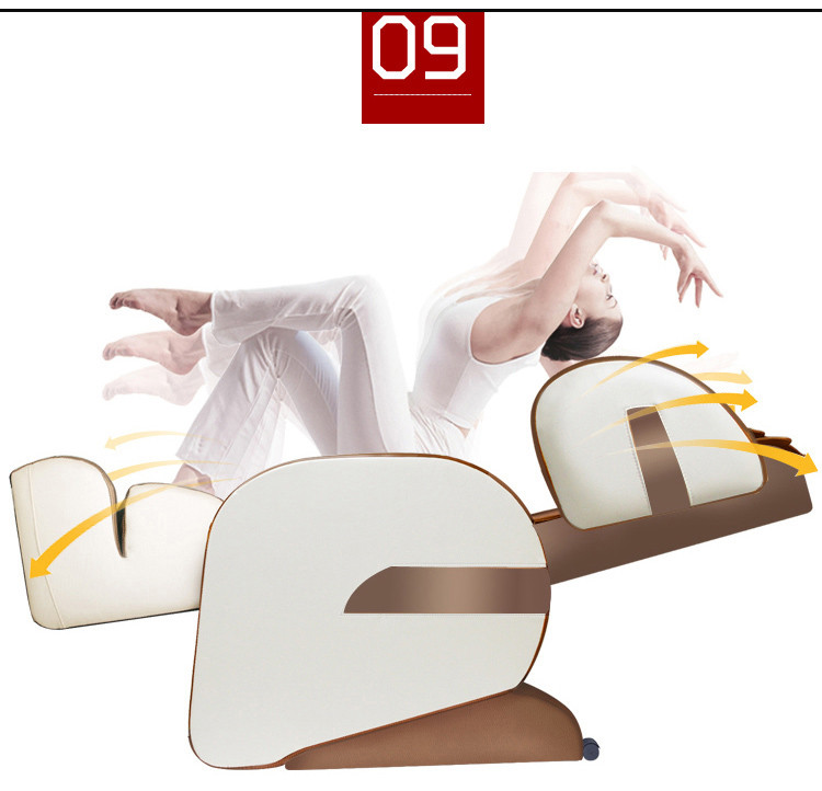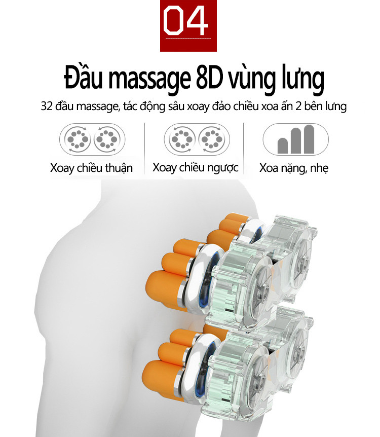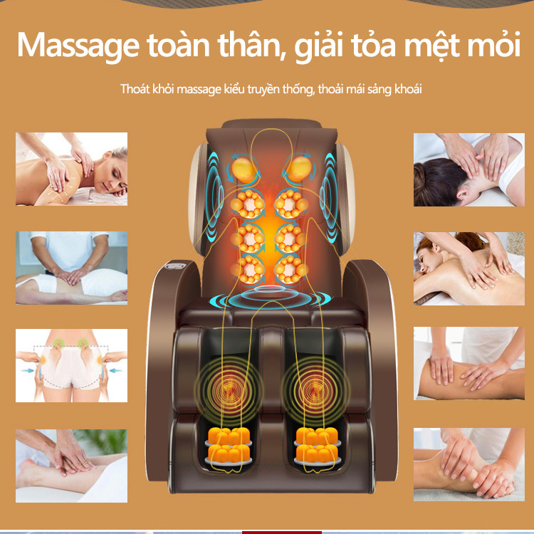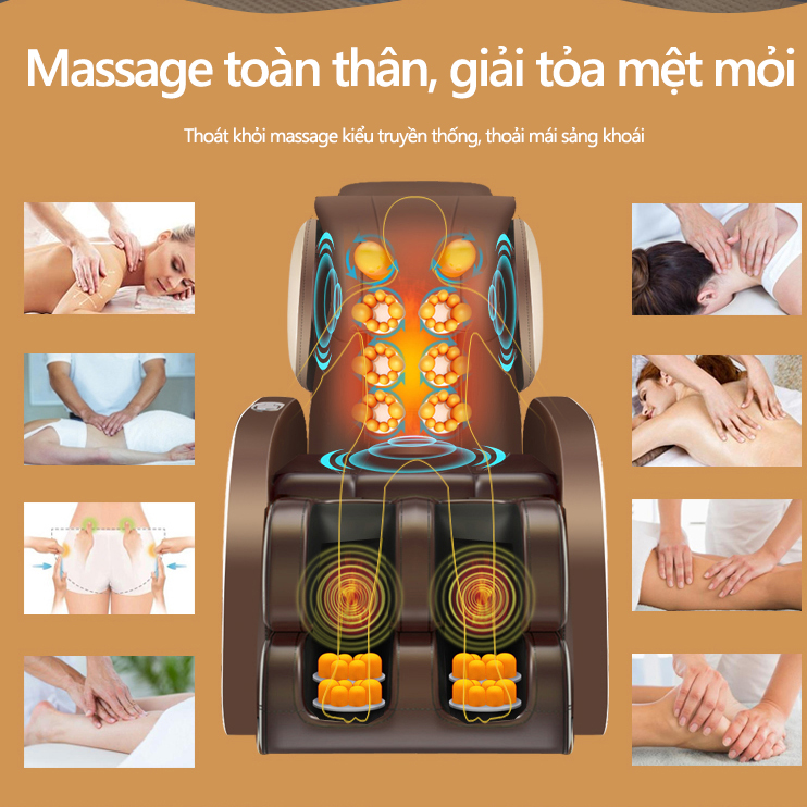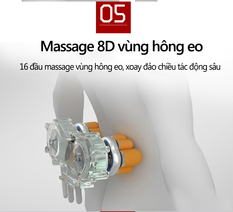 Không tốn không gian trong nhà, có thể đế cách tường chỉ khoảng 5cm Nhiều đầu masage cơ học mô phỏng như thủ pháp tay người Trục ghế cong SL theo đường cong cơ thể cho đầu masage tiếp xúc gần sát hơn với cơ thể Phần đệm chân có thể chỉnh cho phù hợp với chiều cao mỗi người Con lăn mát xa cạo gió gan bàn chân