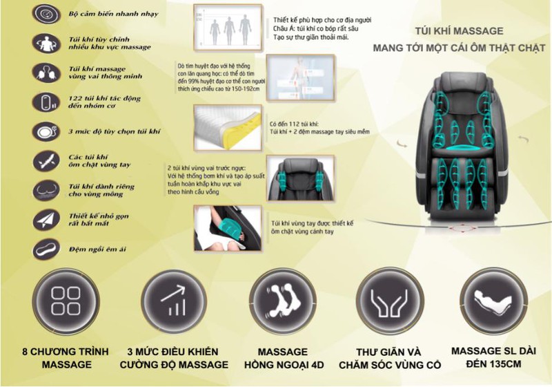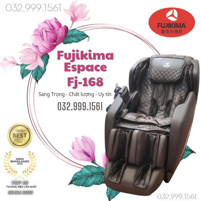 Tên SP FJ-168 (Fujikima 168)Góc gập 105o-170o Khối lượng 110kgNguồn điện 220V-240V; 50Hz-60HzCông suất tiêu thụ 150WMàu sắc Đỏ – Trắng; NâuThời gian liệu trình 15-30 phútChức năng 8 chương trình massage tự động toàn thân; tự động dò tìm huyệt đạo với hệ thống con lăn quang học; 112 túi khí với 3 mức độ tùy chọn thông minh tác động đến hầu hết các nhóm cơ trên cơ thể; hồng ngoại 4D; nâng dần và hạ dần tựa lưng, chân; massage bàn chân, xoa bóp từ ngoài vào trong, từ trong ra ngoài, vỗ, điều chỉnh lực xoa bóp và lực vỗ, massage khí nén cho bàn chân và mông.Thiết bị an toàn Chế độ bảo vệ quá nóng, quá dòng, quá tải điện áp, và rối loạn chương trình, chức năng tự động tắt khi quá tải phần massage chân và bàn chân.- Các dòng ghế massage toàn thân:Ghế Massage FUJIKIMA Espace FJ-B296Ghế Massage FUJIKIMA Espace FJ-168Ghế Massage FUJIKIMA FJ-1100 PRO Smart Massage ChairGhế Massage FUJIKIMA FJ-G579Ghế Massage FUJIKIMA Sunlight FJ-A431Ghế Massage FUJKIMA STAR- A389Ghế Massage FUJIKIMA FJ- X1109Ghế Massage FUJIKIMA FJ-909FXGhế Massage FUJIKIMA FJ-A1007Ghế Massage FUJIKIMA FJ-B779Ghế massage FUJIKIMA Sky Pro FJ-A644Ghế Massage Smart FUJIKIMA FJ-1100GLXGhế Massage Sport FUJIKIMA FJ-606MAXGhế massage FUJIKIMA-FJ-C106