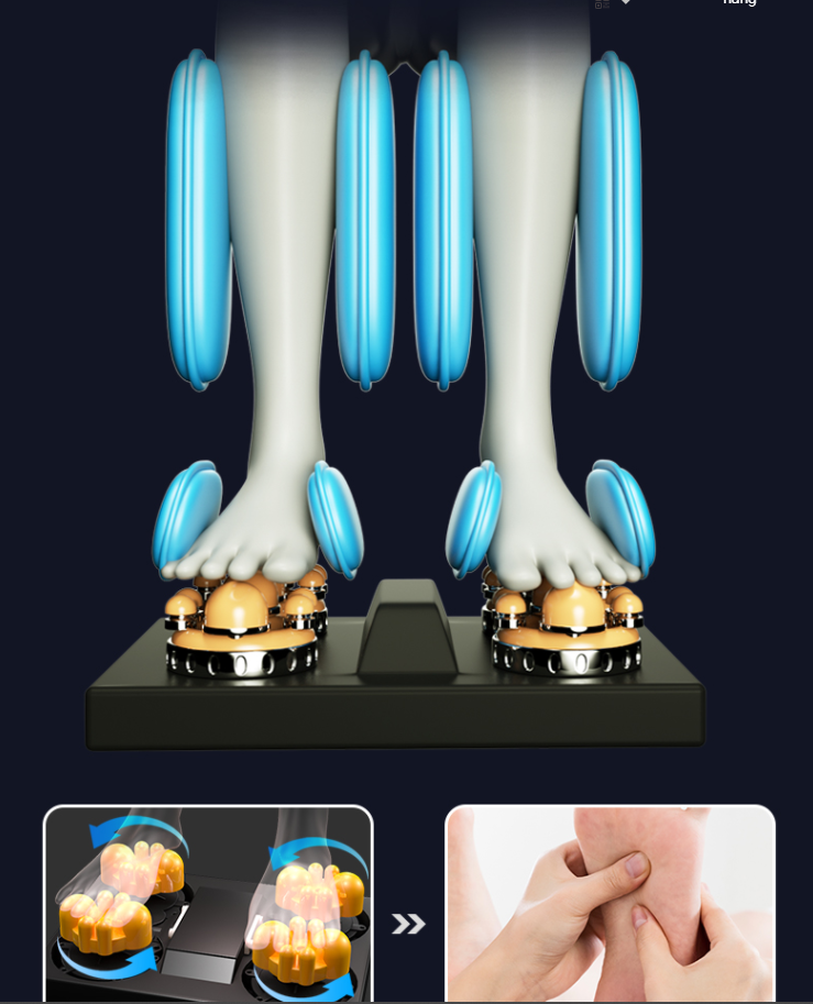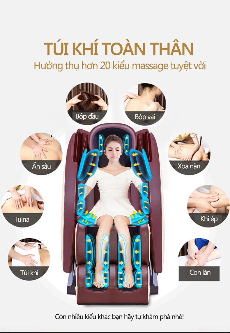 Thông tin chi tiết:Kích thước: 118x76x102 cmTrọng lượng: 61KgĐiện áp:220V/50HzCông suất: 120WChất liệu: Da PU.Bảo hành: 1 đổi 1 miễn phí trong vòng 3 tháng - sửa chữa tại nhà trong vòng 3 năm.Chức năng:- Bi xoay cố định trải dài khắp cơ thể.- Hệ thống túi khí tất cả các vị trí.- Điều khiển: Màn hình cảm ứng - Chế độ không trọng lực giúp kéo giãn cơ thể, êm ái.- Nhiệu hồng ngoại.- Loa không dây bluetooth.- Có nhiều chương trình massage tự động : 10 -15-20 -25-30 phút.- Massage full lòng bàn chân.- Điều chỉnh cường độ.
