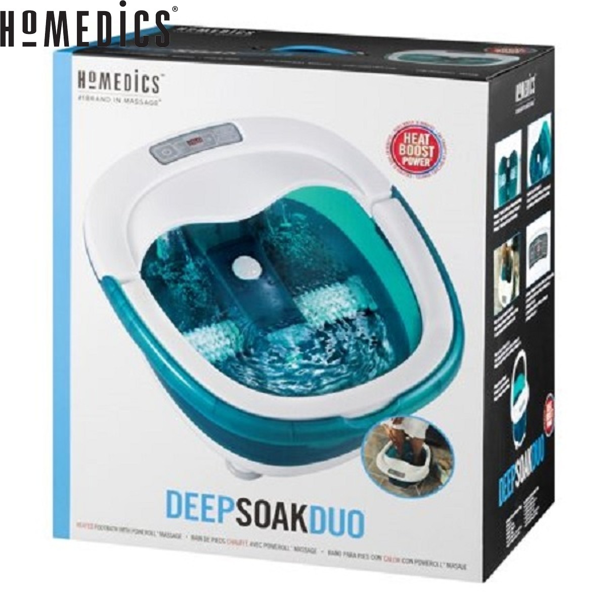 HoMedics Deep Soak Duo Footbath With Poweroll Massage sử dụng các con lăn kép tự động xoay làm xoa dịu gan bàn chân một cách hiệu quả . Bồn ngâm chân massage 2 trong 1 có thể được sử dụng để massage chân ngâm với nước hoặc massage chân khô mà không cần dùng nước , làm nóng nước lạnh trong vài phút và duy trì nhiệt độ trong suốt quá trình ngâm chân ( sử dụng công nghệ làm nóng nước và con lăn kép xoay tự động tiên tiến USA được cấp chứng nhận FDA về độ an toàn khi sử dụng ) . Nhiệt độ ngâm chân lên tới 48 độ C .Dễ dàng lựa chọn và điều chỉnh nhiệt độ nước nóng theo sở thích cùng với chế độ massage con lăn xoay tự động trêm bảng điều khiển . Giúp đôi bàn chân của bạn được thư giãn tối đa, giảm các cơn đau chân do vận động, đứng trong thời gian dài . Giúp bạn ngủ ngon và sâu hơn sau một ngày làm việc mệt mỏi .