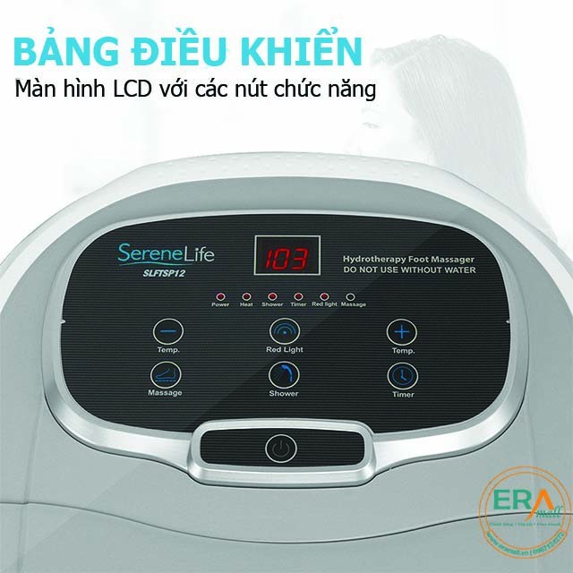 + Tính năng nổi trội của bồn ngâm chân massage con lăn tự động Serenelife SLFTSP12Massage với 6 con lăn tự động. Có 3 vùng massage gan bàn chân.Lựa chọn được chế độ nhiệt massage lên tới 48 độ C. Chế độ đèn hồng ngoại.Nắp đậy thiết kế đặc biệt giúp làm nóng nước nhanh, xông hơi bàn chân.Có dàn phun nước massage mu bàn chân.Có chức năng hẹn giờ cài đặt thời gian từ 10 – 60 phút tích hợp màn hình hiển thị thời gian còn lại.Khay chứa hương liệu thảo mộcTrang bị bánh xe di chuyển.Có vòi xả nước sau khi sử dụng giúp vệ sinh sau mỗi lần sử dụng cực kỳ đơn giản và dễ dàng.Bảng điều khiển trực quan với các nút chức năng to rõ, dễ sử dụngThân bồn được làm từ nhựa ABS đảm bảo độ bềnDung tích bồn chứa 15 lítVietinbank Đông Đô đã phát hành bảo hiểm với mức trách nhiệm bảo hiểm 100 triệu đồng cho khách hàng khi sử dụng bồn ngâm chân SereneLife.