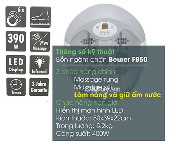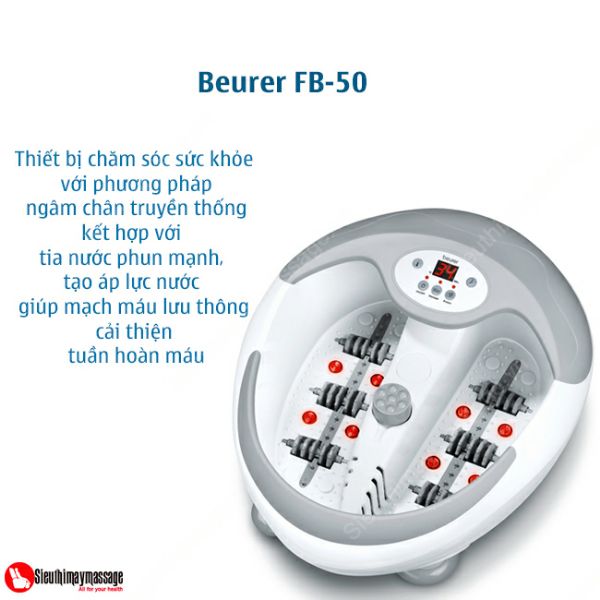 Bồn ngâm chân Beurer FB50 Nhập khẩu ĐứcBồn ngâm chân Beurer FB50 được sản xuất và nhập khẩu tại Đức, đây được coi là dòng sản phẩm chất lượng với đầy đủ tính năng massage chuyên dụng giúp con người giải tỏa căng thẳng và mệt mỏi, có thể trị được nhiều các bệnh về lạnh chân, lạnh tay…