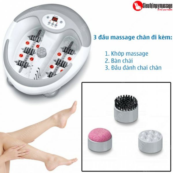 Những kiểu massage của Bồn ngâm chân Beurer FB50.Massage rung, massage nhiệtMassage rung, massage nhiệt, massage sủi khíMassage rung, massage nhiệt, massage sủi khí, massage hồng ngoạiBồn ngâm chân Beurer FB50 được trang bị về tính năng làm nóng nước, người tiêu dùng có thể điều chỉnh nhiệt độ ngâm chân từ 35-48 độ C, đây là tính năng được nhiều người yêu thích vì không phải mất thời gian pha nước.Bộ 3 mài gót chân, massage lòng bàn chân, tiện lợi, tự động chạy khi lực nhấn chân nhấn xuống, tạo cảm giác thư thái, máy có thể loại bỏ phần da chết ở lòng bàn chân và gót chân.Bồn ngâm chân Beurer FB50 có tính năng hẹn giờ ngâm chân, khi bật máy, máy sẽ tự động đặt hẹn giờ 20 phút, tuy nhiên người tiêu dùng có thể điều chỉnh theo ý thích từ 20 – 60 phút, với người bình thường nên ngâm chân trong 20 phút.Hệ thống 6 con lăn được chia làm 2 bên, mỗi bên 3 con lăn, khi người sử dụng di chuyển chân, con lăn sẽ lăn theo và bấm vào các huyệt đạo trong lòng bàn chân, tạo cảm giác thư giãn tuyệt vời, lòng bàn chân được coi là trái tim thứ 2 của cơ thể, chứa hàng ngàn dây thần kinh, vì vậy mà massage lòng bàn chân đem lại hiệu quả rất tốt.Bồn ngâm chân Beurer FB50 được thiết kế sang trọng, hiện đại, dung tích nước 5L, có vạch Max và Min báo mực nước, máy được trang bị 6 đèn hồng ngoại có khả năng trị liệu tốt khi ngâm chân, làm giảm đau từ vết xưng.