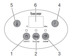 – Chức năng hẹn giờ: Bạn có thể cài thời gian sử dụng từ 20 đến 60 phút với chức năng hẹn giờ. Mỗi lần nhấn nút hẹn giờ (4), thời gian sẽ tăng thêm 10 phút. Hết thời gian cài đặt, máy sẽ tự động tắt. Thời gian sử dụng tối đa là 60 phút một lần. Sau đó tắt bồn, nghỉ ít nhất 15 phút trước khi sử dụng lại.