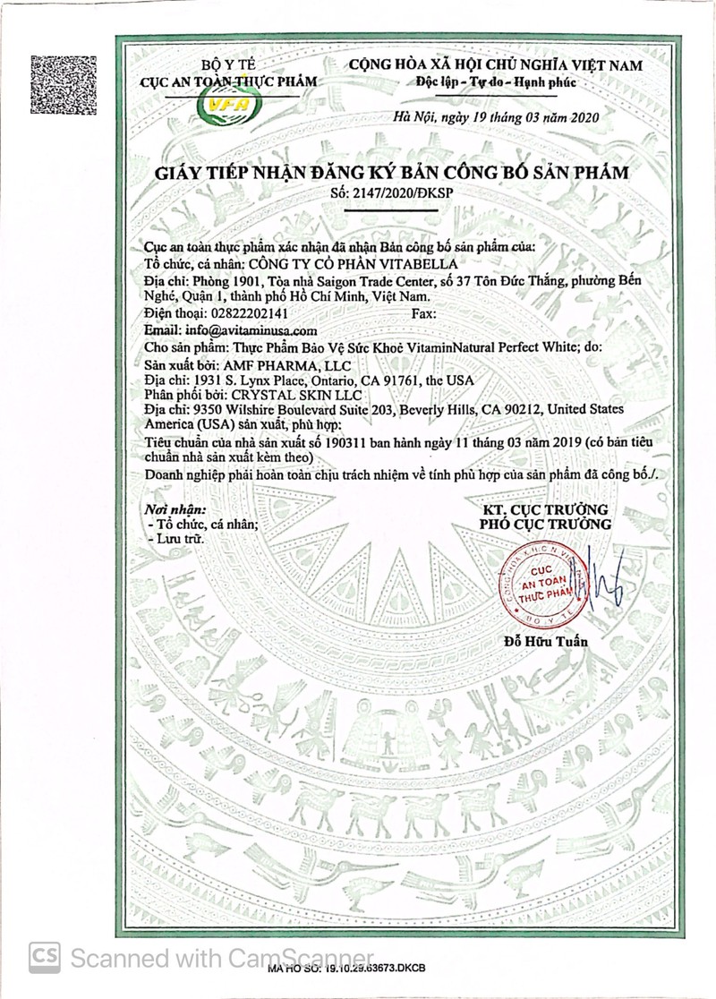 - Vitamin Natural Perfect White được sản xuất bởi AMF Pharma, LLC và phân phối bởi Crystal Skin LLC của Mỹ. Đây là công ty có dây chuyền sản xuất khép kín và công nghệ tiên tiến đã đạt các tiêu chuẩn khắt khe của Mỹ về sức khỏe như FDA, cGMP nên các bạn có thể hoàn toàn yên tâm về chất lượng của sản phẩm.