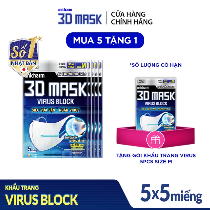 [Tặng 1 gói Khẩu trang Virus] Combo 5 gói Khẩu trang ngăn vi khuẩn Unicharm 3D Mask Virus Block size M gói 5 miếng (Ngăn được bụi mịn PM2.5)