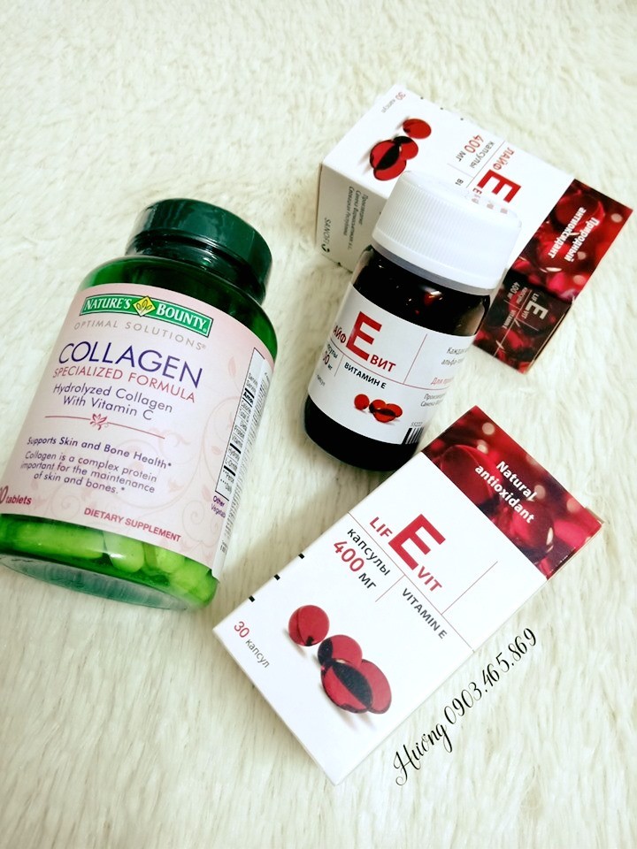 👉 Công dụng collagen:- Loại collagen Nga này đã bổ sung luôn cả vitamin C. Dòng natura nên cơ thể dễ chuyển hoá hấp thụ tốt hơn.- Giúp bổ sung collagen ngăn ngừa lão hoá, giảm nám tàn nhang, da căng mịn trắng sáng.👉 Công dụng Vitamin E:Vitamin E đỏ Zentiva của Nga là một sản phẩm cung cấp vitamin E được chiết xuất 100% từ các nguyên liệu tự nhiên, có rất nhiều tác dụng tốt trong việc chăm sóc sức khỏe và làm đẹp.- Vitamin E giúp trẻ hóa làn da, chống lão hóa da và oxi hóa, giúp da mị màng và căng mịn hơn. Giúp cải thiện vùng da chảy xệ trở nên săn chắc đồng thời tái tạo lớp da mới giúp da trắng sáng, làm mờ sẹo, các vết thâm nám, tàn nhang- Đối với tóc thì Vitamin E giúp tóc óng mượt mà, ngăn ngừa gãy rụng, kích thích mọc tóc, hạn chế tình trạng tóc bị chẻ ngọn, khô xơ, giúp tóc bóng mượt tự nhiên.- Đối với phụ nữ mang thai Vitamin E giúp làm giảm tỉ lệ sảy thai, sinh non, giúp cho thai nhi phát triển.Với phụ nữ ở độ tuổi mãn kinh, vitamin E giúp làm giảm hiện tượng bốc hoả.- Ở tuổi vị thành niên, vitamin E có thể làm giảm triệu chứng đau bụng kinh, điều hoà kinh nguyệt.- Tăng cường hệ thống miễn dịch và ngăn ngừa dịch bệnh theo mùa. Giúp hỗ trợ giảm các bệnh về đường hô hấp và đường tiêu hóa👉 Cách dùng:Collagen và vitamin E đều uống mỗi loại 1 viên/ 1 ngày sau ăn sáng