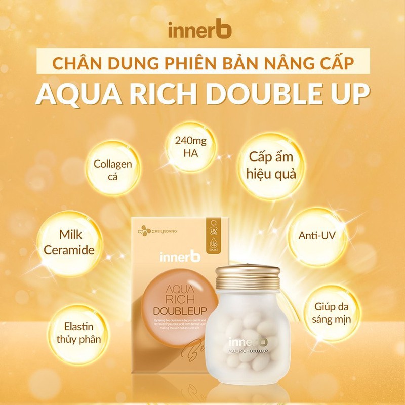 Dưới tác động từ môi trường, ánh nắng mặt trời càng trở nên độc hại với tia UVA và UVB gây ảnh hưởng trực tiếp tới sức khỏe và làn da. Lối sống bận rộn cũng khiến da dễ bị tổn thương, thô ráp, kém sức sống vì thiếu nước, thiếu ẩm, lão hóa sớm và xỉn màu. Với “phiên bản nâng cấp” của Aqua Rich, Aqua Rich Double Up chứa gấp đôi hàm lượng Hyaluronic Acid (240mg/ 2 viên), mang lại hiệu quả tối đa, không chỉ cấp nước, cấp ẩm mà còn hỗ trợ giúp da sáng mịn, bảo vệ da trước tác hại từ môi trường. Chỉ 2 viên Innerb Aqua Rich Double Up mỗi ngày cho làn da khỏe mạnh và sáng mịn trước tác hại của tia cực tím gây hại.