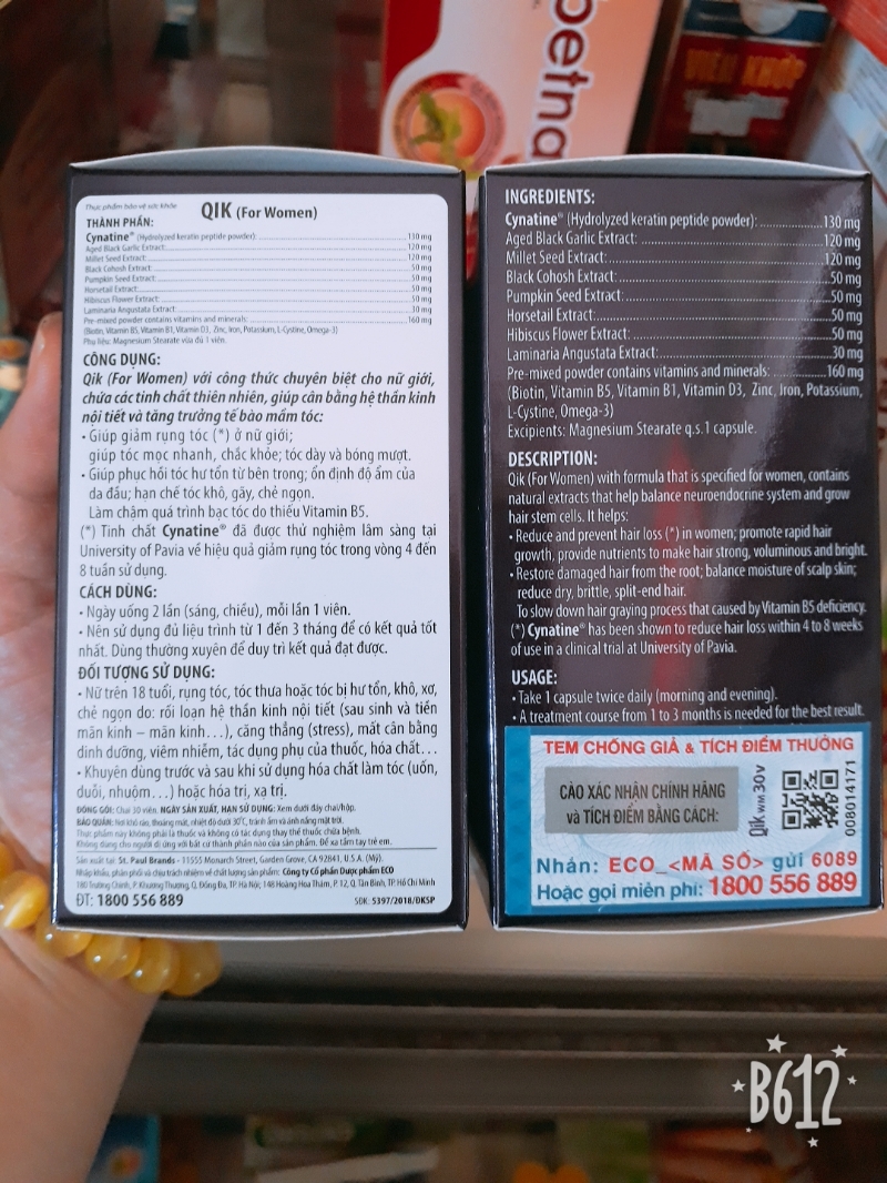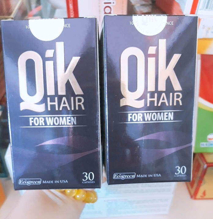 Qik for women với công thức chuyên biệt dành cho nữ giới, chứa các tinh chất thiên nhiên, giúp cân bằng hệ thần kinh và nội tiết và tăng trưởng tế bào mầm tóc: - Giúp giảm rụng tóc ở nữ giới; giúp mọc tóc nhanh, chắc khỏe, tóc dày và bóng mượt. - Giúp phục hồi tóc hư tổn từ bên trong, ổn định độ ẩm của da đầu, hạn chế tóc khô, gãy, chẻ ngọn. - làm chậm quá trình bạc tóc do thiếu vitamin B5 Tinh chất Cynatine đã được thử nghiệm lâm sàng tại University of Pavia về hiện quả giảm rụng tóc trong vòng 4 đến 8 tuần sử dụng. CÁCH DÙNG: - Ngày uống 2 lần (sáng, chiều), mỗi lần 1 viên - Nên sử dụng đủ liệu trình từ 1 đến 3 tháng để có kết quả tốt nhất. Dùng thường xuyên để duy trì kết quả đạt được. ĐỐI TƯỢNG SỬ DỤNG: - Nữ trên 18 tuổi, rụng tóc, tóc thưa, hư tổn... - Dùng trước hay sau khi sử dụng hóa chất, hóa trị.
