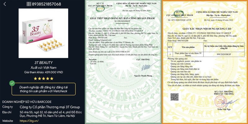 Dựa vào mã vạch được in trên bao bì, khách hàng có thể dễ dàng tra cứu thông tin sản phẩm 3T Beauty trên phần mềm Scan & Check (Phần mềm của Tổng cục tiêu chuẩn đo lường chất lượng Việt Nam). Hoặc phần mềm Vietcheck thuộc Công ty cổ phần Mã hóa Việt Nam. 3T Beauty cũng đã được Bộ y tế chứng nhận với Số đăng ký: 890/2020/ĐKSP.