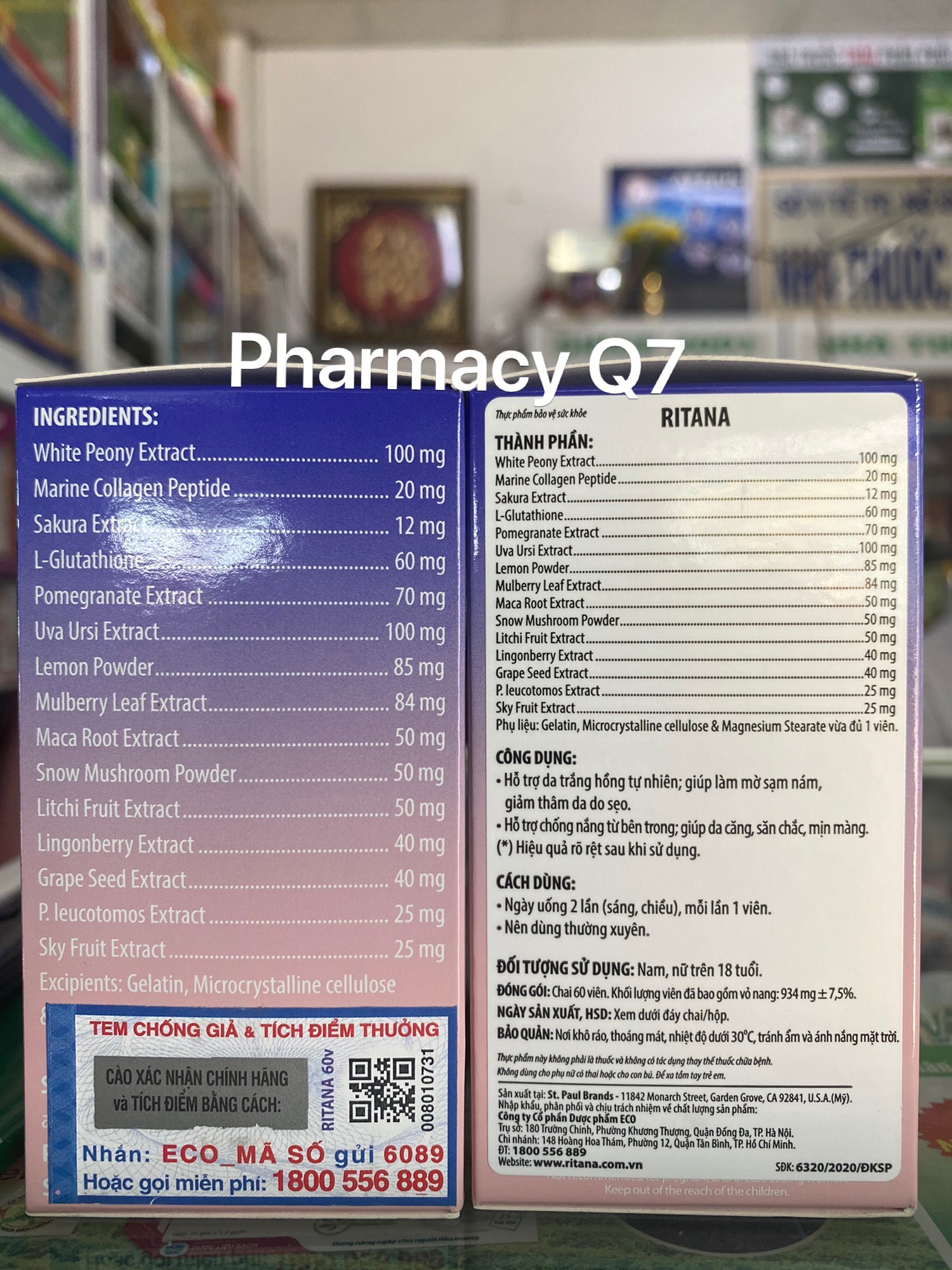 Viên uống trắng da RiTANA 60VTrắng da, da bật tông trắng hồng, trắng khoẻ tự nhiên.Mờ sạm nám, vết thâm mụn; ngăn ng�� 650.000đ