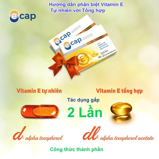 + Vitamin E Tự nhiên chiết xuất từ các loại hạt trong tự nhiên có thành phần cấu tạo: D-alpha tocopherol ( các sản phẩm E tự nhiên tiêu biểu: Ecap, Enat…) - Tác dụng tốt, thành phần tự nhiên nên giá cao hơn Vitamin E tổng hợp.