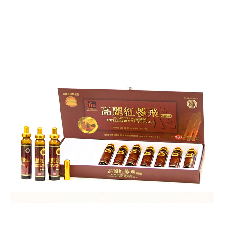 Thành phần: Cao cô đặc Hồng Sâm (6 năm tuổi, thể cứng 60%, thành phần Hồng Sâm hơn 70mg/g) 3%, nước ép quả Lê, đường Oligo Saccharide, glyopexis 70, mật ong , Cao cô đặc Linh Chi, nước chiết xuất Nhung Hươu, nước đường, sữa ong chúa, xiro ngô fructose, chất bảo quản: acid citric (330).