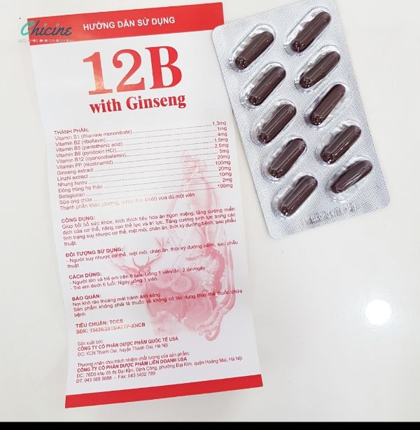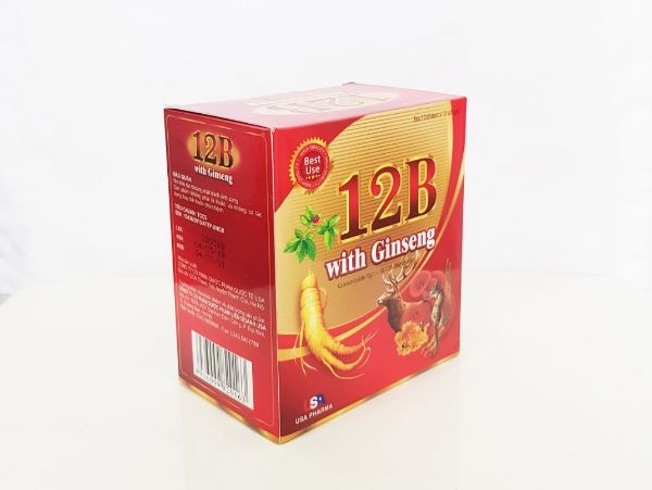 Thành phần:Mỗi viên nang mềm có chứa:Vitamin B1………….1,3 mgVitamin B2………….1mgVitamin B5………….4mgVitamin B6………….1.5mgVitamin B12………..2.5mcgVitamin PP………….5mgGinseng extract……20mgLinzhi extract………..100mgNhung hươu………..20mgĐông trùng hạ thảo…10mgSữa ong chúa…………100mgBetaglucan……………..2mgCông dụngGiúp bồi bổ sức khỏe, kích thích tiêu hóa, ăn ngon miệng, tăng cường miễn dịch của cơ thể, nâng cao thể lực và trí lực. Tăng cường sinh lực trong các tình trạng suy nhược cơ thể, mệt mỏi, chán ăn, sau phẫu thuậtCách dùng:Người lớn và trẻ em trên 6 tuổi: 1 viên/lần x 2 lần/ngàyTrẻ em dưới 6 tuổi ngày uống 1 viênQuy cách:Hộp 10 vỉ x 10 viênNhà sx:Công ty cổ phần dược phẩm quốc tế USA