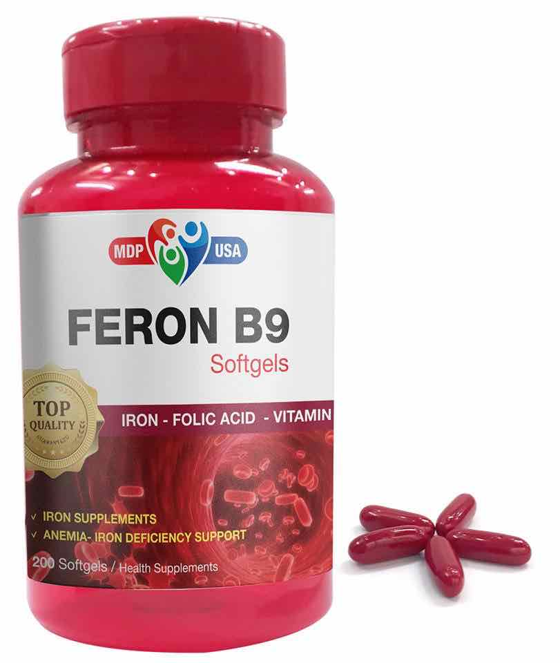 - Viên sắt Feron B9 hỗ trợ bổ sung sắt, acid folic và các thành phần cần thiết cho quá trình tạo máu; giúp dự phòng thiếu máu và thiếu sắt trong các trường hợp mất máu do phẫu thuật, chấn thương, người hiến máu.