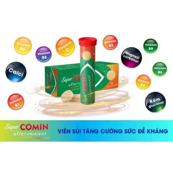 Viên sủi <SUPERCOMIN EFFERVESCENT> chứa các vitamin như C, B1, B2, B3, B4, B5, B6, B8, B9, B12, Calci, Magnesi carbonat và kẽm gluconat giúp bạn luôn có tinh thần tỉnh táo, nạp năng lượng, phục hồi và tăng cường sức khỏe.