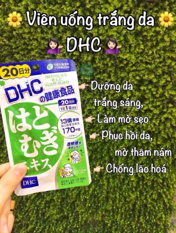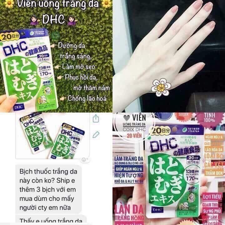 🌿THẦN DƯỢC DƯỢC TRẮNG🌿Chỉ sau 1 gói 20 ngày là khen nức khen nở!Nào là da cứ trong vắt, mà mịn màng, hết bay sạm xỉn các thứ!Nào là sáng lên nhìn thấy bằng mắt thường, tự tin hơn bao nhiêu!Nên gái nào có nhu cầu 💦DƯỠNG TRẮNG💦 thì nhanh chân nhaaaa!!!‼️‼️ Thành phần chính của viên uống trắng da DHC được chiết xuất từ hạt Coix được coi là “viên ngọc lúa mạch” trong y học, là một loại thảo dược mọc quanh năm ở khu vực Đông Dương. Tinh chất có trong hạt có tính năng làm trắng, mịn & ngăn ngừa khô nứt da, giàu chất dinh dưỡng, nó phục vụ để tạo ra độ ẩm, làm cho da trở nên mềm và mịn màng như da em bé. Kết hợp với vitamin E đem đến vẻ đẹp trẻ trung cho phái nữ. Hơn nữa, đây là loại hạt đã được sử dụng nhiều pha trộn cùng với ngũ cốc, lúa mạch, ngọc trai -> trong công thức chế tạo mỹ phẩm làm đẹp ở lĩnh vực chăm sóc sức khỏe và sắc đẹp.
