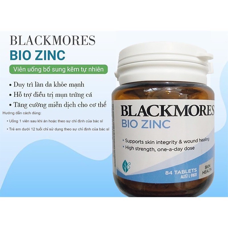 Viên uống bổ sung kẽm Blackmores Bio Zinc 84 viên của Úc là sự kết hợp giữa kẽm và nhiều dưỡng chất khác nhau giúp hỗ trợ việc xử lý mụn trứng cá và làm lành v ết th ương trên da, làm giảm các rối loạn về da như: vi êm da và giúp duy trì làn da được săn chắc, tăng cường hệ thống mi ễn d ịch đặc biệt là duy trì t inh tr ùng khỏe mạnh ở nam giới, kết hợp với Lalisse no2 hay Tinh dầu Hoa Anh Thảo Evening Primrose Oil có tác dụng hiệu quả trong việc xử lým ụn tr ứng cá, mụn bọc, mụn ẩn cho da mặt một cách tối ưu nhất. Blackmores Bio Zinc còn chứa các dưỡng chất quan trọng tốt cho tuyến ti ền li ệt.