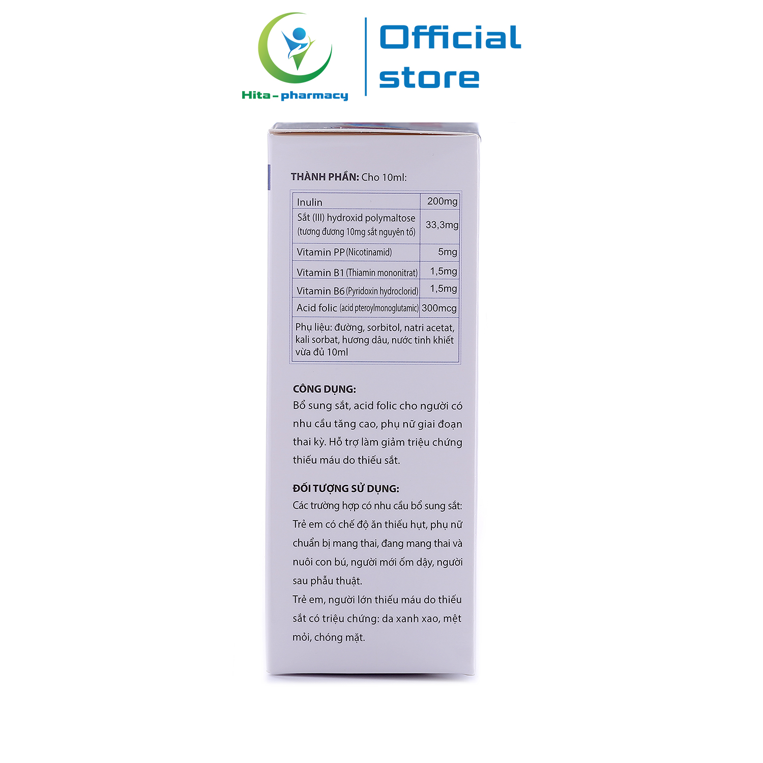 - Sắt (III) hydroxid polymaltose : 33,3 mg- Acid folic : 300 mcg- Inulin 200 : mp- Vitamin B1 : 1,5mg- Vi