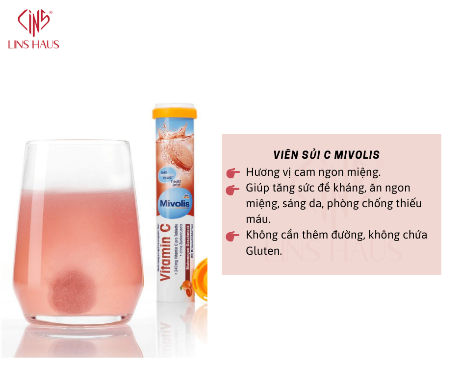Viên sủi Vitamin tổng hợp Mivolis giúp bổ sung 10 loại vitamin có lợi cho sức khỏe. Hương vị cam ngon miệng, không cần thêm đường, không chứa Gluten/ Lactose, thuần chay.