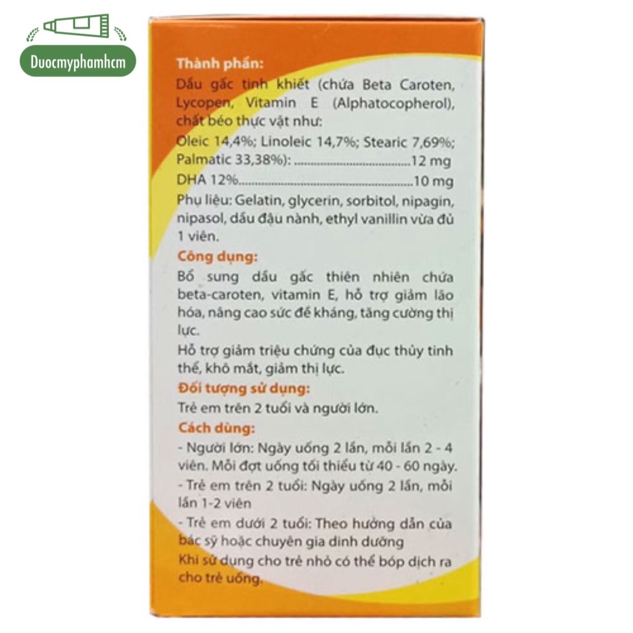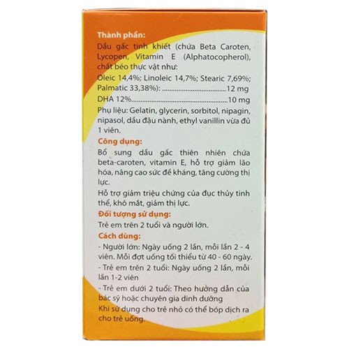 Thành phần:Dầu gấc tinh khiết (chứa Beta Caroten, Lycopen, Vitamin E, chất béo thực vật như:Oleic 14,4%; Linoleic 14,7%; Stearic 7,69%; Palmatic 33,38%):...............................12mgDHA 12%.............................................10mgPhụ liệu: Gelatin, glycerin, sorbitol, nipagin, nipasol, dầu đậu nành, ethyl vinallin vừa đủ 1 viên.