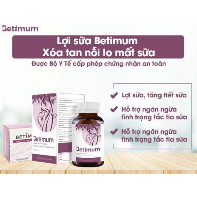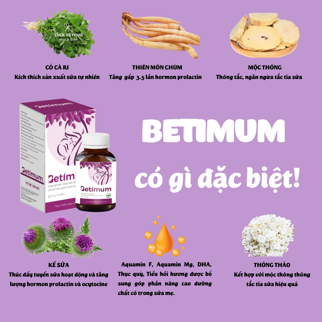 1. Thành phần: 1.1. Cốm lợi sữa dạng viên BETIMUM: Chiết xuất thiên môn chùm, Cao mộc thông, Thông thảo, Chiết xuất cỏ cà ri (fenugreek), Chiết xuất kế sữa, Aquamin F, Aquamin Mg, DHA, Chiết xuất thục quỳ, Tiểu hồi hương. Các thành phần này có chứa saponin steroid, hàm lượng phenol lipophilic cao, giàu khoáng chất kèm với nhiều loại vitamin A, B1, B2, C, E, Mg, P, Ca, Fe, axit folic, tinh dầu và tanin.1.2. Cốm lợi sữa dạng bột BETIMUM M: Chiết xuất thiên môn chùm, Curcumin 95%, Saffron, Chiết xuất tiêu đen, Collagen Peptid, Sữa gầy (skim milk), Chất phụ gia Maltodextrin, Chất phụ gia Sucralose. Các thành phần này có chứa Saponin steroid, Piperine, hàm lượng chất béo, chất đạm cao, giàu khoáng chất kèm với nhiều loại vitamin A, B1, B2, C, E, Mg, P, Ca, Fe, axit folic, tinh dầu và tanin.