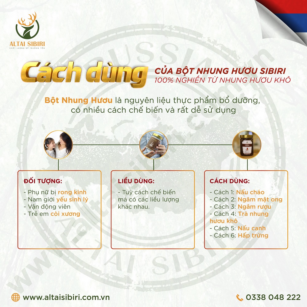 3. HƯỚNG DẪN SỬ DỤNG-Nấu cháo: Bột nhung hươu 2-5g cho vào nồi cháo đã ninh nhừ trước đó.-Ngâm với mật ong: Cho bột nhung hươu 100g vào bình rồi đổ 1/4 lít mật ong vào ngâm trong vòng 35 – 40 ngày là có thể đem dùng được.-Trà nhung hươu khô: Dùng bột nhung hươu pha trà để uống như bình thường. Cách hãm rất đơn giản, giống như các loại trà thông thường khác (trà xanh, trà hoa cúc …).-Nấu canh: Có thể sử dụng bột nhung hươu khô để nấu những món ăn ngon, bổ dưỡng và có lợi cho sức khỏe như hầm canh nhung hươu khô cùng với nấm, chân giò, gà, ba ba, …-Ngâm rượu: Cho 100g bột nhung hươu vào bình thủy tinh. Đổ 2 lít rượu có nồng độ 45 – 50º, ngâm trong thời gian 3-4 tháng là sử dụng được-Trứng gà hấp nhung hươu: Lấy bột nhung hươu 0,5-1g, trứng gà 1 quả, cho bột nhung hươu vào trong trứng gà hấp chín, hàng ngày ăn vào buổi sáng sớm lúc đói bụng, cần ăn 15-20 ngày