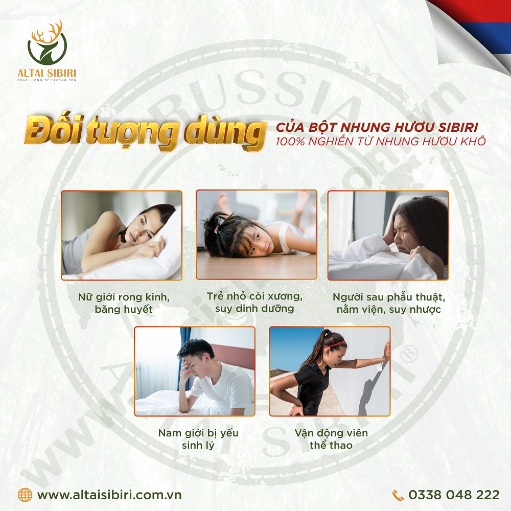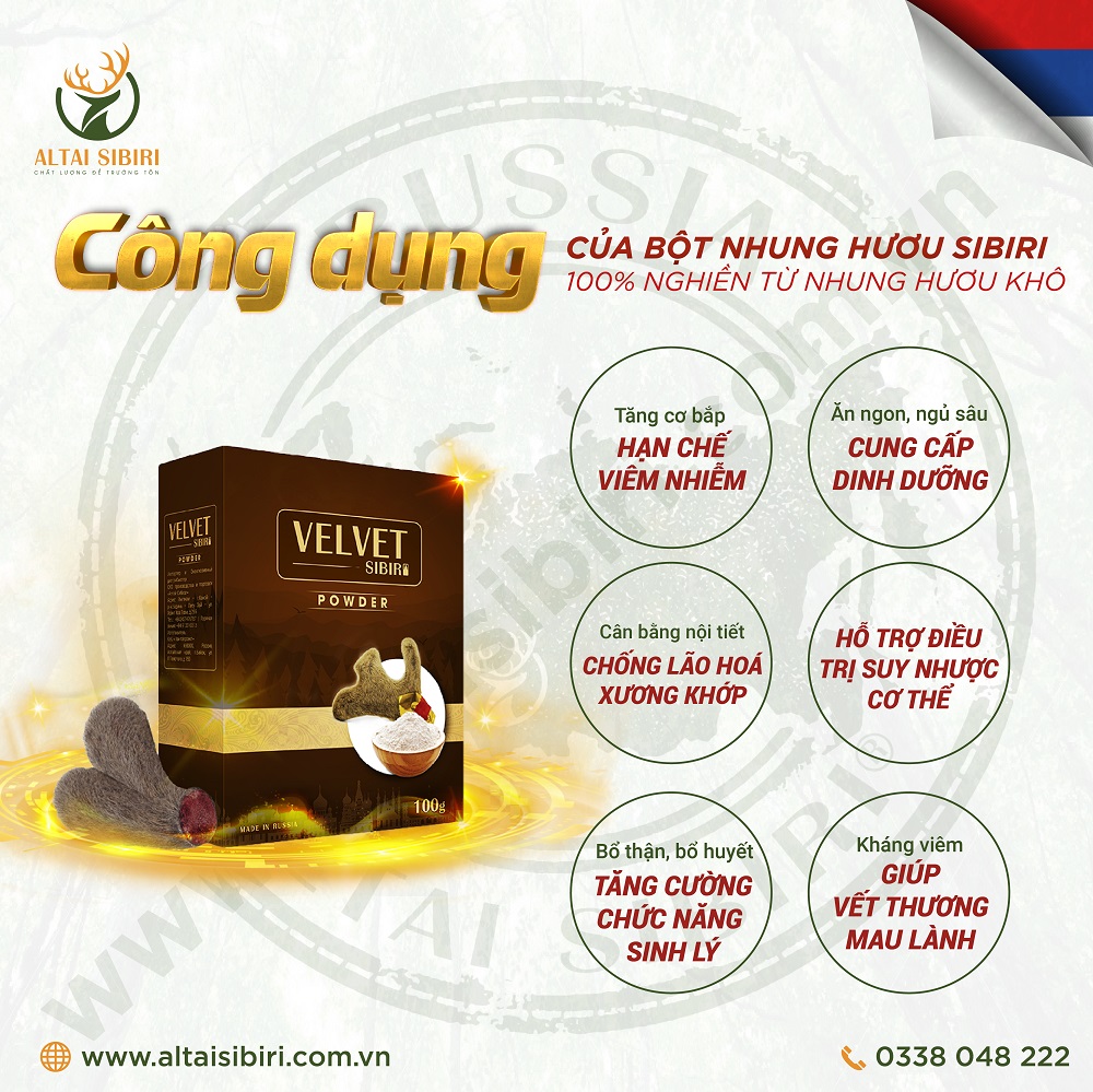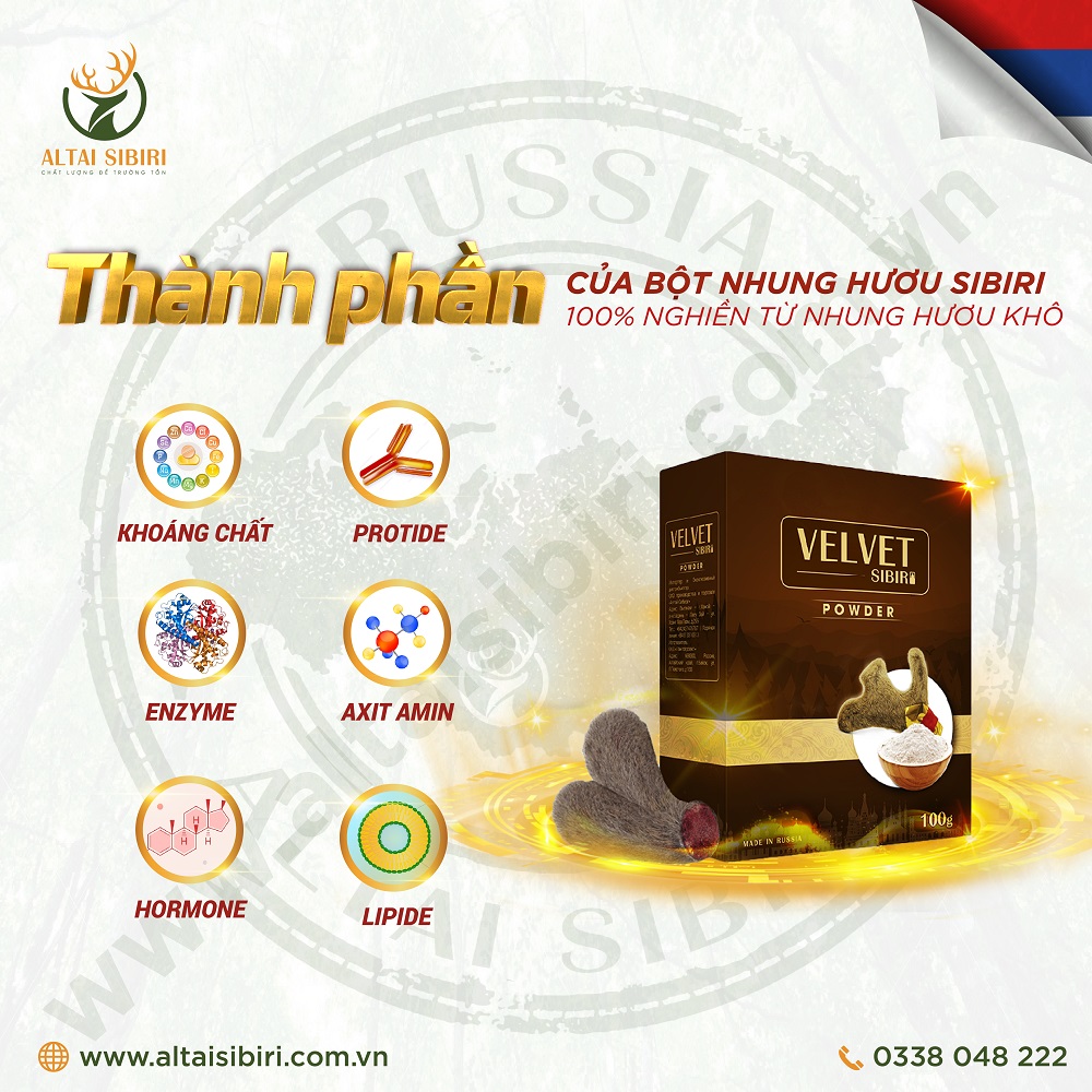 1. THÀNH PHẦN100% nhung hươu tươi nhập khẩu tại vùng núi Altai Siberia Liên Bang Nga.Thành phần: Protide 52,5%, Lipide 2,5%, Acid amin (có 25 loại, trong đó có đủ các acid amin cần thiết cho cơ thể). Các chất khoáng: ca, p, mg, na, k, fe, co, zn… Các hoạt chất sinh học (chất keo keratin, chollagen, chondroitin, acid hyaluronic, glucosaminoglycants, prostaglandin). Các hormone (lộc nhĩ tinh pantocrin, oestrogen, androgen, testosterone). Enzyme (catalase, các men chống oxy hóa).