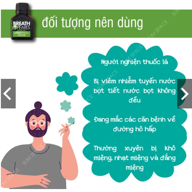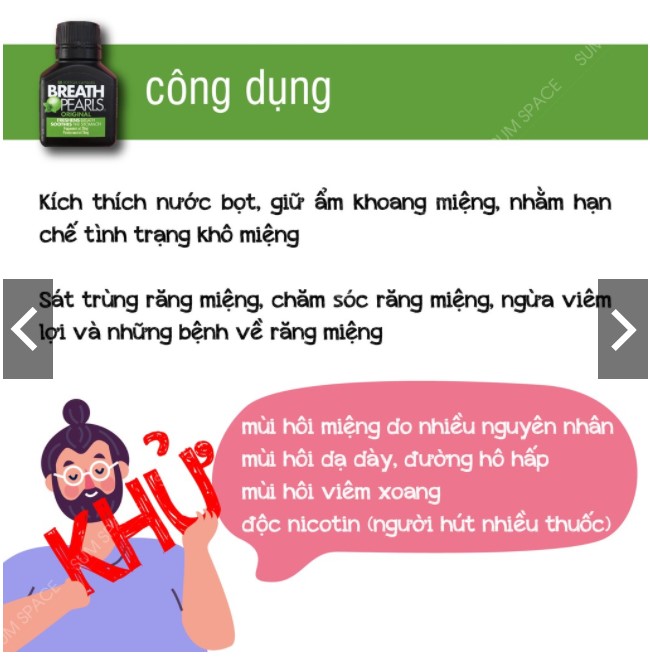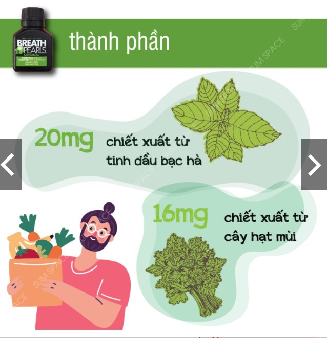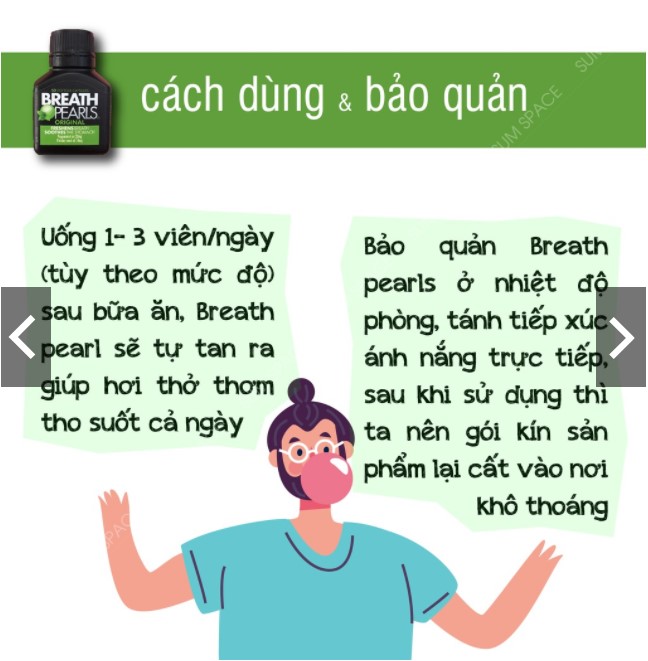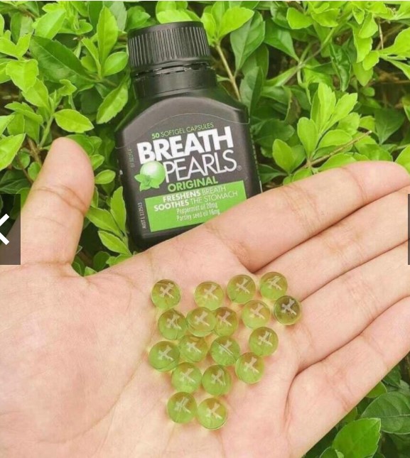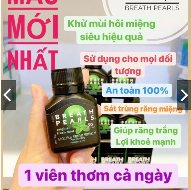 Viên thơm miệng Breath Pearls mùi bạc hà, cứu nguy cho các bác có vấn đề về hơi thở. CÔNG DỤNG: ✔️Viên uống thơm miệng Breath pearls của Úc gíup thích nước bọt, giữ ẩm khoang miệng, giúp hạn chế tình trạng khô miệng Khử mùi hôi miệng do nhiều nguyên nhân với viên uống thơm miệng của Úc ✔️Khử mùi hôi dạ dày đường hô hấp ✔️Khử mùi hôi viêm xoang ✔️Sát trùng răng miệng, ngừa viêm lợi và các bệnh về răng miệng ✔️Khử độc nicotin (tốt cho những người hút nhiều thuốc) CÁCH DÙNG: - Ngày uống 1- 3 viên Breath pearls của Úc (tùy theo mức độ) sau bữa ăn, viên thuốc sẽ tự tan ra, hơi thở thơm tho suốt cả ngày - Sử dụng thường xuyên sẽ cải thiện tình trạng hơi thở