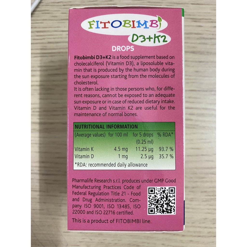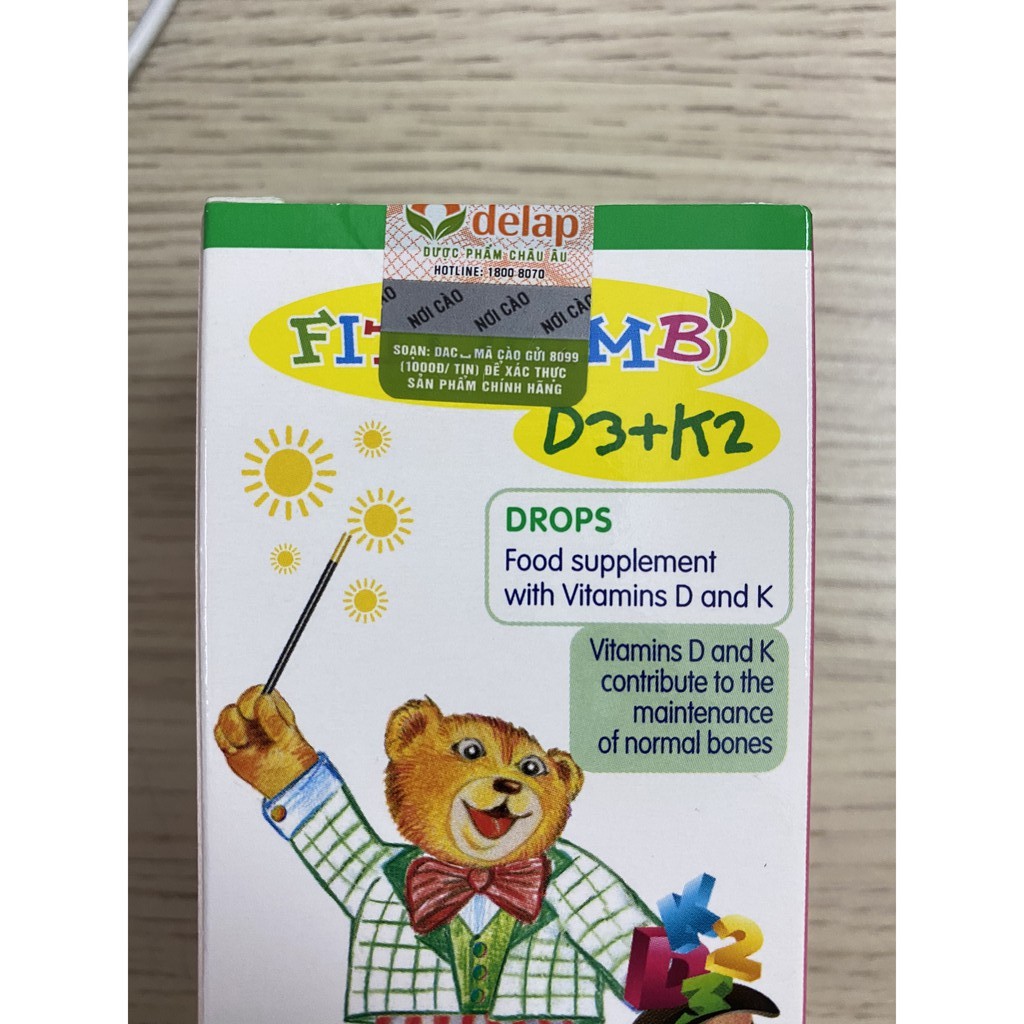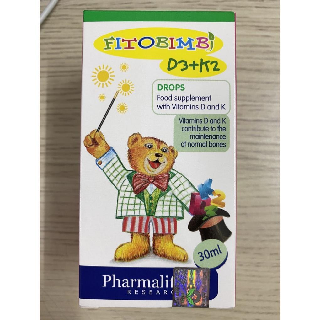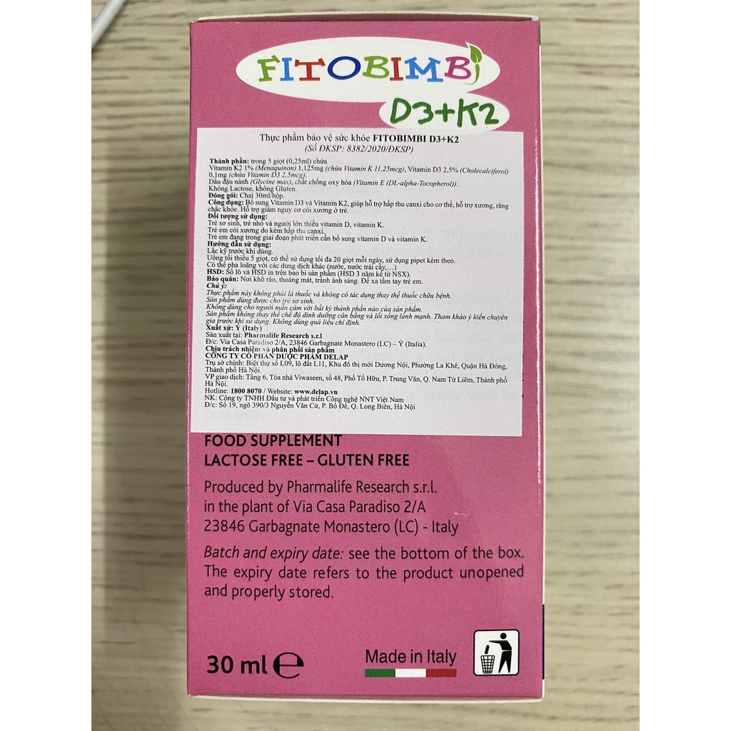 Fitobimbi D3+K2.Bổ Sung Vitamin D3K2 Giúp Hấp Thụ Canxi Vào Xương Răng Chắc KhỏeCÔNG DỤNG- Bổ sung vitamin D3 và vitamin K2, giúp hỗ trợ hấp thu canxi cho cơ thể.- Hỗ trợ xương, răng chắc khỏe.- Hỗ trợ giảm nguy cơ còi xương ở trẻ.ĐỐI TƯỢNG SỬ DỤNG- Dùng được cho trẻ sơ sinh từ 1 ngày tuổi- Trẻ sơ sinh, trẻ nhỏ và người lớn thiếu vitamin D, vitamin K.- Trẻ em còi xương do kém hấp thu canxi.- Trẻ em đang trong giai đoạn phát triển cần bổ sung vitamin D và vitamin K.CÁCH DÙNG - Lắc kỹ trước khi dùng. Uống tối thiểu 5 giọt (0,25ml), có thể sử dụng tối đa 20 giọt mỗi ngày, sử dụng pipet kèm theo.- Sản phẩm có thể pha loãng với các dung dịch khác (nước, nước trái cây,…).QUY CÁCH : LỌ 30 MLXUẤT XỨ : ÝHẠN DÙNG : 04 NĂM KỂ TỪ NGÀY SẢN XUẤTTHỰC PHẨM NÀY KHÔNG PHẢI LÀ THUỐC, KHÔNG CÓ TÁC DỤNG THAY THẾ THUỐC CHỮA BỆNH#fitobimbi #calcio #fitobimbicalcio #calci #canxi #vitamin #vitamind #chieucao #coixuong #phattrien #bé #trẻ #sosinh #suydinhduong #hapthu #hangchinhhang #nhapkhau #tangchieucao #chammocrang #mocrang #cham