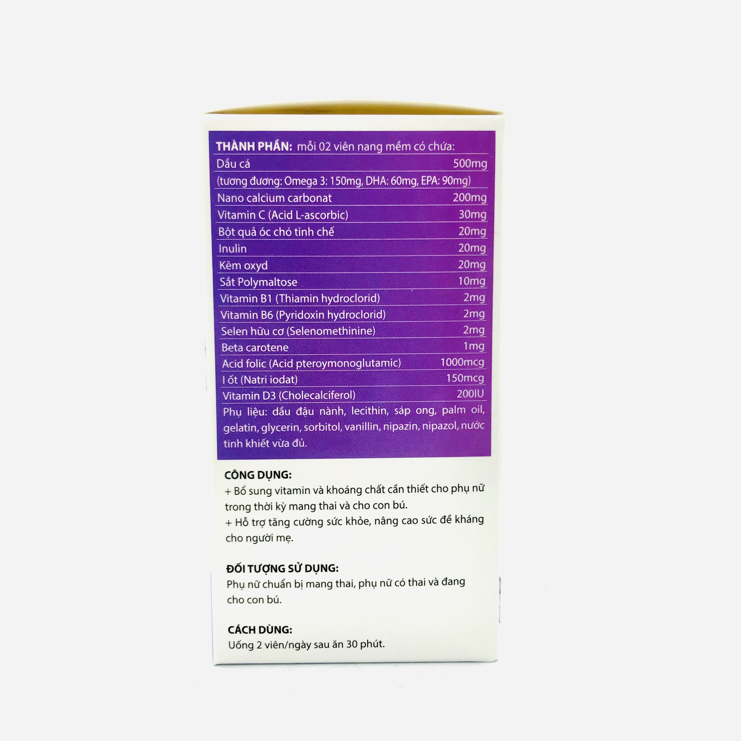 CÔNG DỤNG:_Giúp bổ xung DHA, EPA, vitamin và khoáng chất cần thiết cho cơ thể, hỗ trợ bồi bổ tăng cường sức khỏe, nâng cao sức đề kháng cho mẹ bầu.ĐỐI TƯỢNG SỬ DỤNG:_Phụ nữ chuẩn bị mang thai, đang mang thai hoặc nuôi con bú có nhu cầu bổ xung vitamin, khoáng chất và dưỡng chất do chế độ ăn thiếu hụt, ăn kém, có biểu hiện suy nhược cơ thể.
