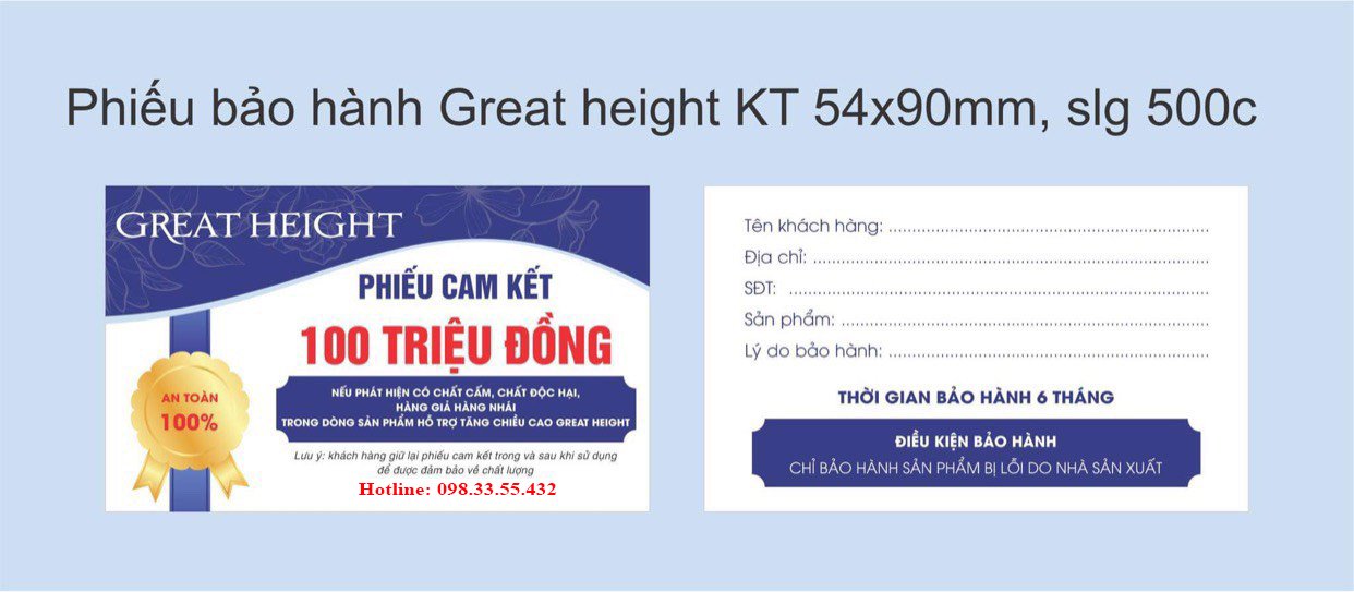 1OO% GREAT HEIGHT được đăng ký bảo hộ nhãn hiệu độc quyền và xác nhận phù hợp tiêu chuẩn Y Khoa. Được chứng nhận chất lượng và cho phép lưu hành của bộ y tế
