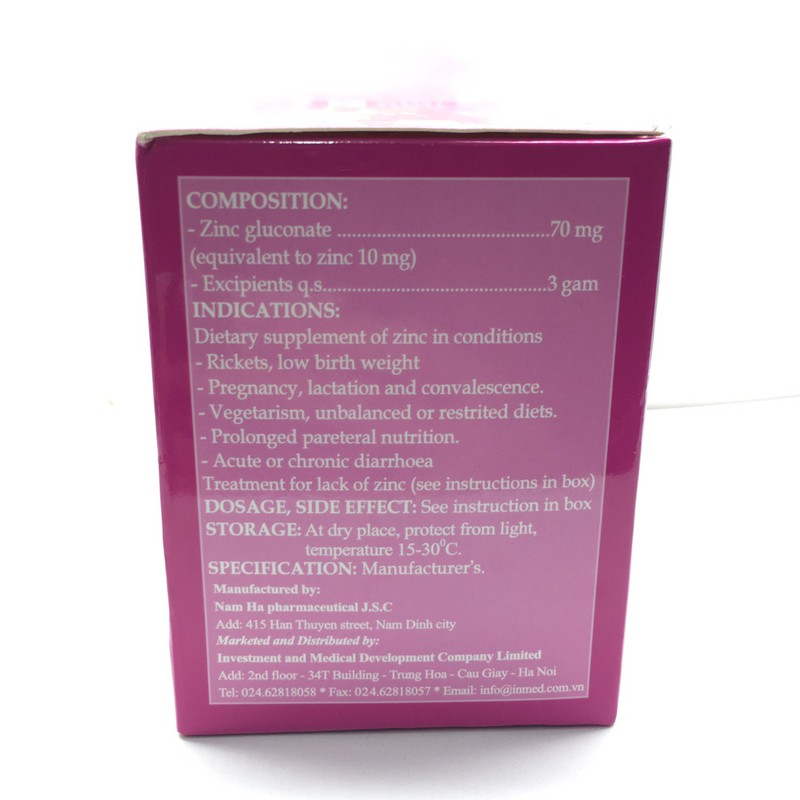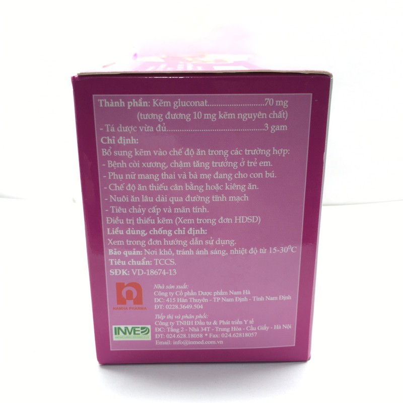Công dụng (Chỉ định)Bổ sung kẽm vào chế độ ăn trong các trường hợp: Bệnh còi xương, chậm tăng trưởng ở trẻ em. Phụ nữ mang thai và bà mẹ đang cho con bú. Chế độ ăn thiếu cân bằng hoặc kiêng ăn. Nuôi ăn lâu dài qua đường tĩnh mạch. Tiêu chảy cấp và mãn tính.Đieu tri thiếu kẽm nhẹ và vừa trong các trường hợp: Suy dinh dưỡng nhẹ và vừa. Rối loạn đường tiêu hóa. Khó ngủ, mất ngủ, trẻ khóc đêm, suy nhược, nhức đầu. Nhiễm trùng tái diễn ở đường hô hấp, đường tiêu hóa, da. Khô da vết thương chậm lành. Khô mắt, loét giác mạc, quáng gà. Thiếu kẽm nặng: được đặc trưng bởi các tổn thương da điển hình trong bệnh viêm ruột, da đầu chi, dầy sừng, hói, loạn dưỡng móng, khô mắt, viêm quanh lỗ tự nhiên. Xem chi tiếtLiều dùngLiều bổ sung dinh dưỡng: Trẻ em 6 - 12 tháng ½ gói/ngày. Trẻ em 1 - 3 tuổi ½ đến 1 gói/ngày. Trẻ em 3 - 10 tuổi 1 gói/ngày. Trẻ em > 10 tuổi ngày 2 - 3 lần, mỗi lần 1 gói. Liều đitr:Theo hướng dẫn của bác sỹ.Uống với nhiều nước sau bữa ăn, có thể hòa tan trong nước đun sôi để nguội. Xem chi tiếtKhông sử dụng trong trường hợp sau (Chống chỉ định)Mẫn cảm với các thành phần của thc. Xem chi tiếtLưu ý khi sử dụng (Cảnh báo và thận trọng)Tránh dùng trong giai đoạn loét dạ dày tá tràng và nôn ói cấp tính. Nên uống cách xa các thuốc có chứa calci, sắt, đồng khoảng 2 - 3 giờ để ngăn ngừa tương tác có thể làm giảm hấp thụ của kẽm.