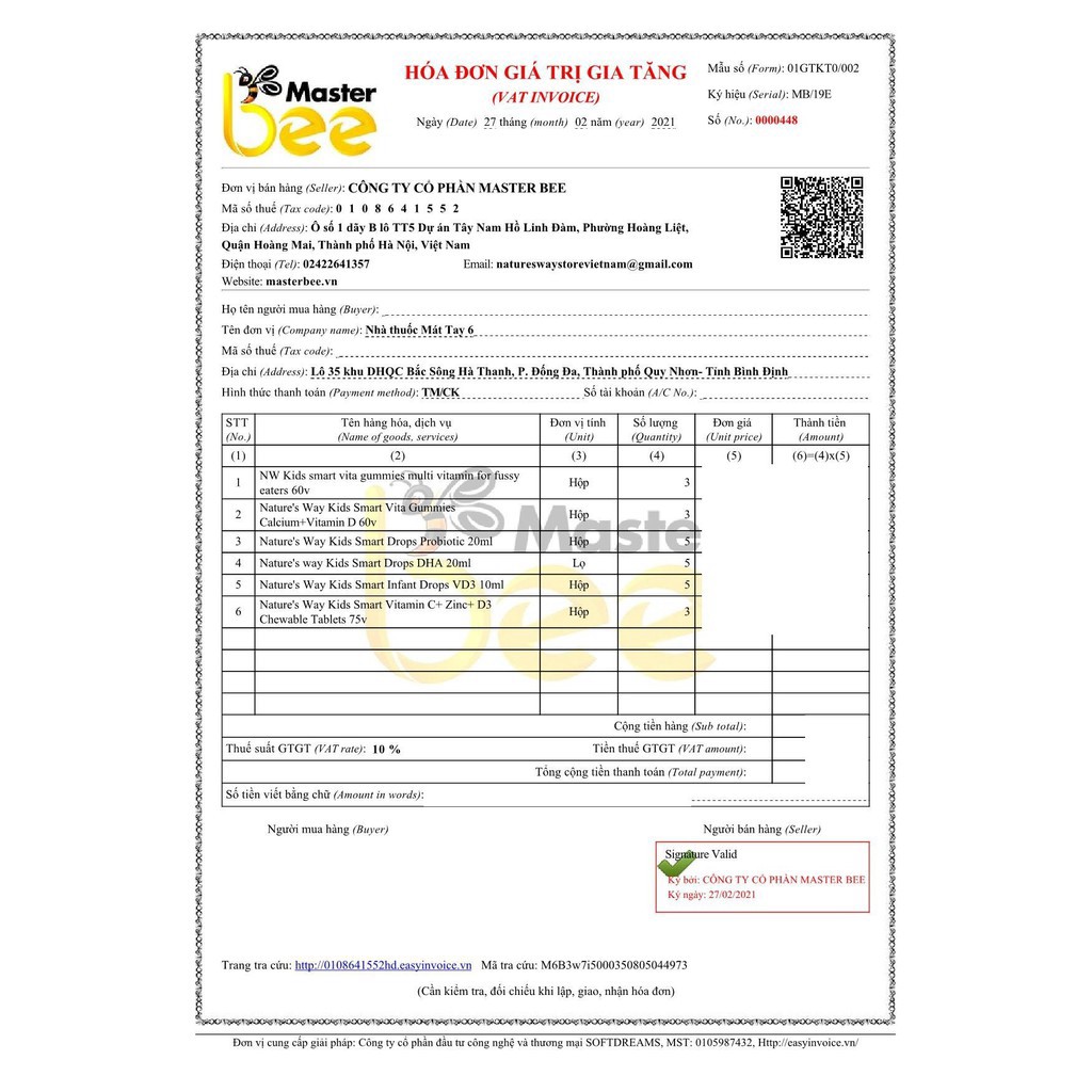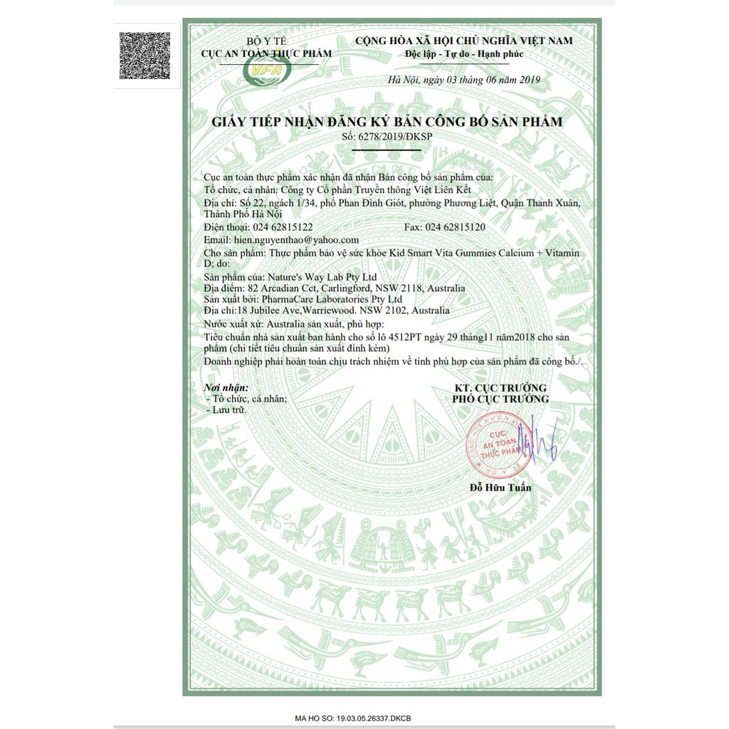 Thành phần : Mỗi 01 viên nhai Nature’s Way Kids Smart Calcium + Vitamin D3 có chứa:- Canxi cacbonat: 1000 mg- Equiv. canxi: 400 mg- Colecalciferol (vitamin D3): 350 IU- Phụ liệu (sulfites; đậu nành): vừa đủ 1 viênCông dụng :Hỗ trợ cung cấp bổ sung lượng canxi, vitamin D3 cần thiết mỗi ngày cho trẻ.- Hỗ trợ xương và răng chắc khỏe, đồng thời hỗ trợ hệ thần kinh khỏe mạnh.- Hỗ trợ tăng sức để kháng và hệ miễn dịch.- Hàm lượng Vitamin D3 trong sản phẩm giúp cơ thể hấp thụ canxi từ thực phẩm và hỗ trợ cho quá trình khoáng hóa xương ở trẻ.Cách dùng : Trẻ em 2 - 8 tuổi: Nhai 2 viên mỗi ngày với bữa ăn, hoặc theo lời khuyên của chuyên gia chăm sóc sức khỏe của bạn.- Trẻ em từ 9 tuổi trở lên: Nhai 2 viên mỗi ngày trong bữa ăn, hoặc theo lời khuyên của chuyên gia chăm sóc sức khỏe của bạn.Lưu ý:- Sản phẩm là dạng viên nhai, không nuốt cả viên.- Bổ sung vitamin không nên thay thế một chế độ ăn uống cân bằng.- Bảo quản sản phẩm ở dưới 25 độ C.Đối tượng sử dụng : Chú ý : Thực phẩm này không phải là thuốc, không có tác dụng thay thế thuốc chữa bệnh.Không dùng cho người có mẫn cảm với bất kỳ thành phần nào của sản phẩmSản phẩm hiện có bán tại Hệ Thống Mát TayĐể biết thêm thông tin chi tiết và cách mua hàng trực tiếp quý khách vui lòng liên hệ hotline : 1900292997HỆ THỐNG NHÀ THUỐC MÁT TAYSố 1: 210 Bạch Đằng – TP. Quy NhơnSố 2: 05B Tăng Bạt Hổ – TP. Quy NhơnSố 3: Ngã 3 Điện Biên Phủ – Trương Vĩnh Ký, TP.Quy NhơnSố 6: Ngã 3 Lê Thanh Nghị – Tố Hữu, Bắc Sông Hà Thanh,TP. Quy NhơnSố 7: Ngã 4 Ngô Mây – Nguyễn Thị Minh Khai, TP. Quy NhơnSố 9: 316 – Nguyễn Thái Học, TP. Quy Nhơn[mát tay online]