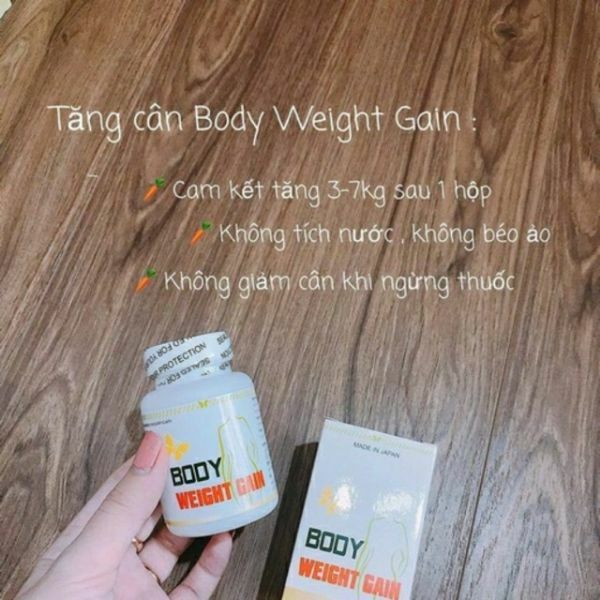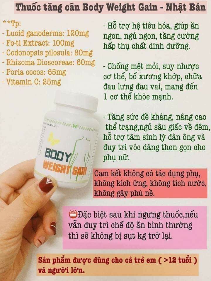 👏👏VIÊN TĂNG CÂN CỦA NHẬT BẢN - BODY WEIGHT GAIN🌷Xuất xứ: JAPAN🌷Sản xuất và phân phối bởi Yakuho🌷Thành phần: - Lucid ganoderma: 120mg- Fo-ti Extract: 100mg- Codonopsis pilosula: 80mg- Rhizoma Dioscoreae: 60mg- Poria cocos: 65mg- Vitamin C: 25mg🌷Công dụng:- Hỗ trợ hệ tiêu hóa, giúp ăn ngon, ngủ ngon, tăng cường hấp thụ chất dinh dưỡng- Tăng cường quá trình trao đổi chất giúp cơ thể mau đói, ăn nhiều hơn, nạp nhiều kalo hơn.- Chống mệt mỏi, suy nhược cơ thể, bổ xương khớp, chữa đau lưng đau vai, mang đến 1 cơ thể khỏe mạnh.- Tăng sức đề kháng, nâng cao thể trạng, đảm bảo ngủ sâu giấc về đêm, hỗ trợ tâm sinh lý.🌷Cách sử dụng:- Sản phẩm được dùng cho cả trẻ em và người lớn- Ngày uống 1 lần trước khi đi ngủ hoặc sau bữa tối 30p👏👏Tùy theo thể trạng và chế độ dinh dưỡng sẽ có mức tăng cân khác nhau, trung bình sau 1 hộp sẽ tăng từ 4-6kg, có thể sử dụng liên tục để duy trì trạng thái ăn ngon, ngủ sâu, chống mệt mỏi và suy nhược cơ thể